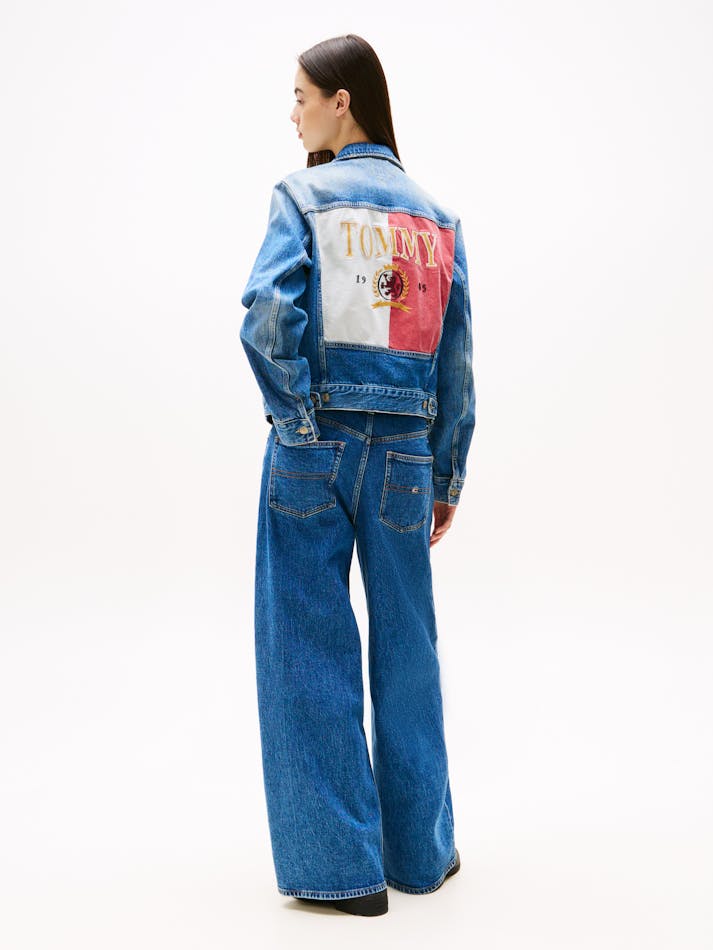 This denim trucker jacket steps things up a notch with its statement back panel enhanced with Tommy Jeans crest embroidery.