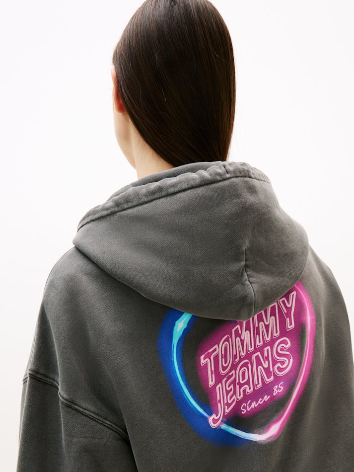 This hoody combines a boxy fit and dropped shoulders with a vibrant logo on the back to create a statement piece.