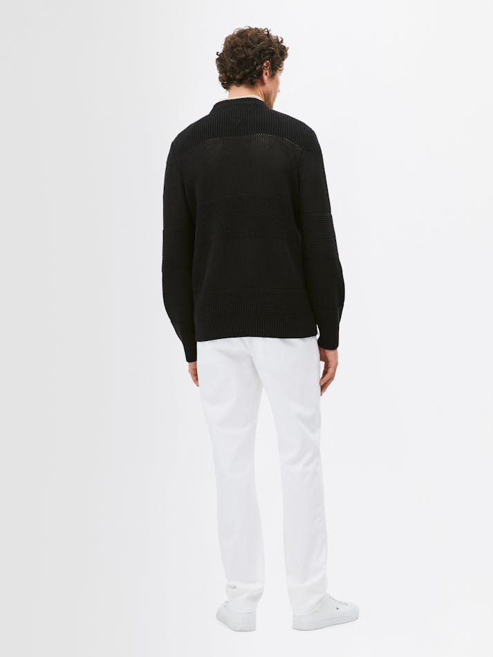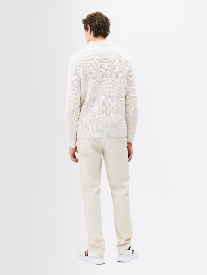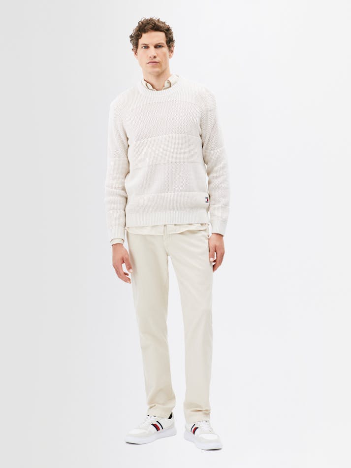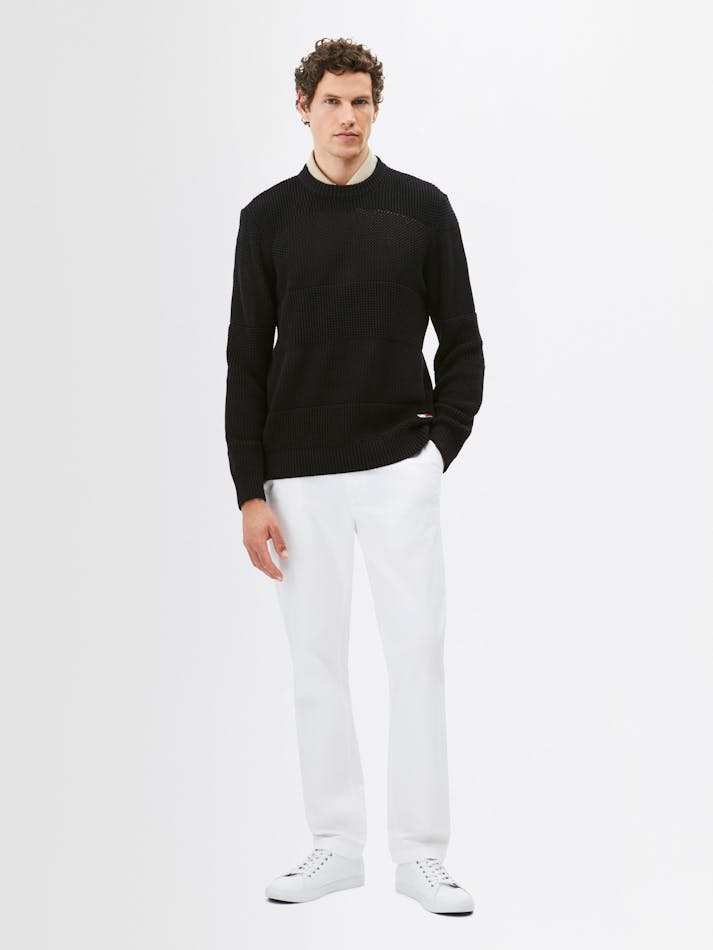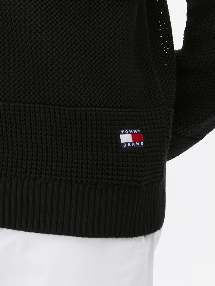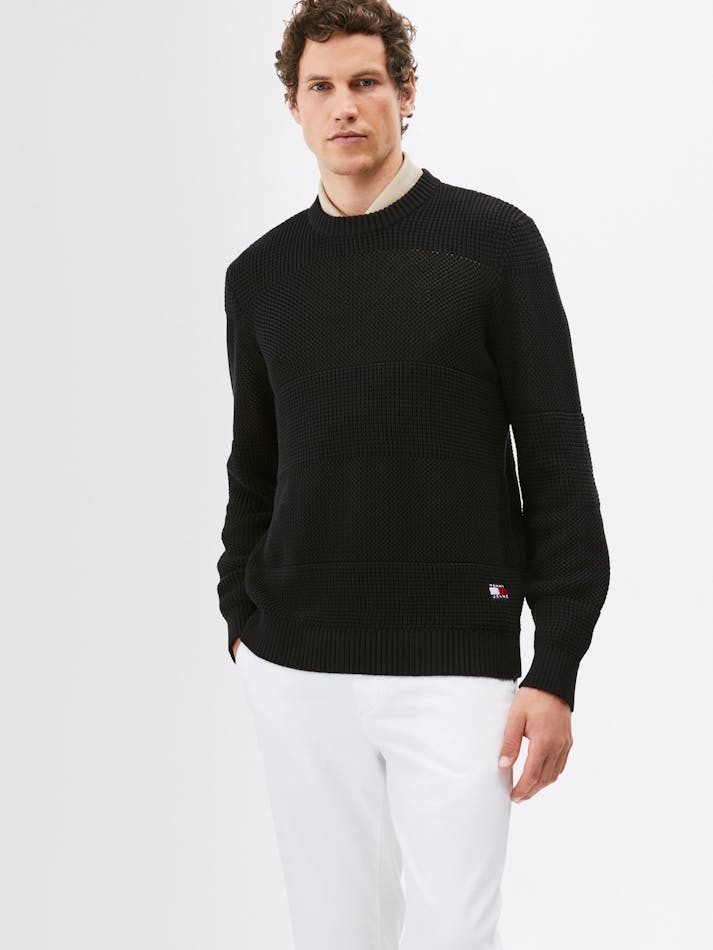 This cosy crochet sweater is elevated by the contrast textured stripe and subtle Tommy Jeans branding. Crafted from soft pure cotton, this cool-weather essential is the ideal addition to your wardrobe.