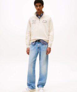 For effortless off-duty style, this quarter zip sweatshirt delivers a clean silhouette with bold branding and a structured stand collar.