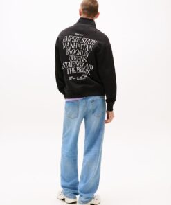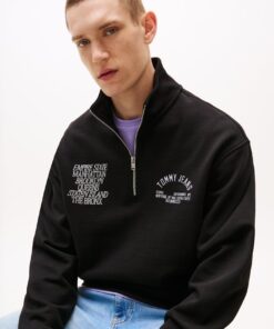 For effortless off-duty style, this quarter zip sweatshirt delivers a clean silhouette with bold branding and a structured stand collar.