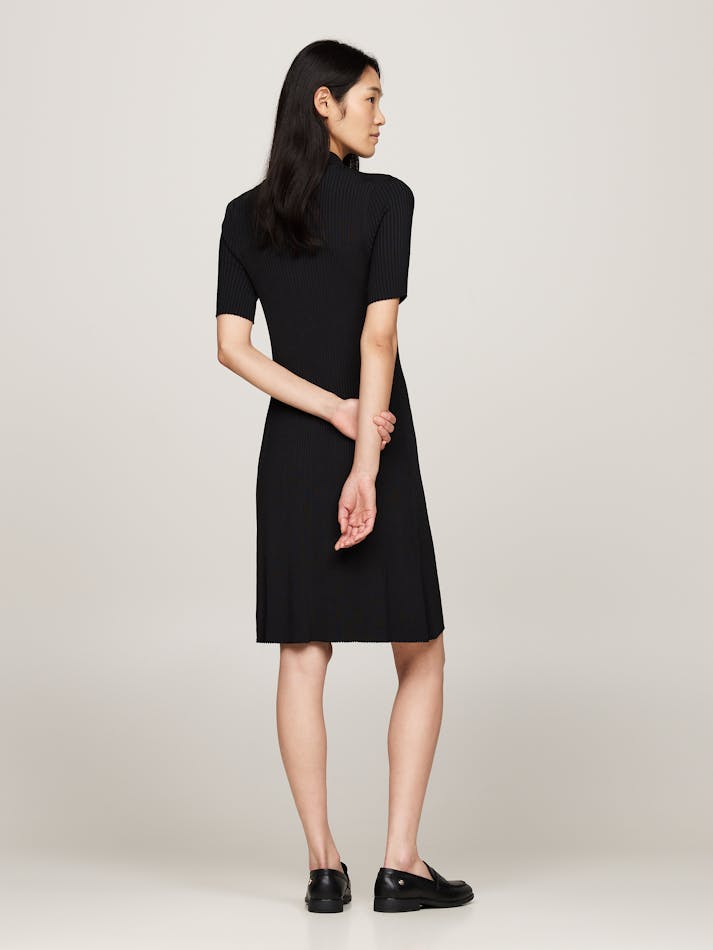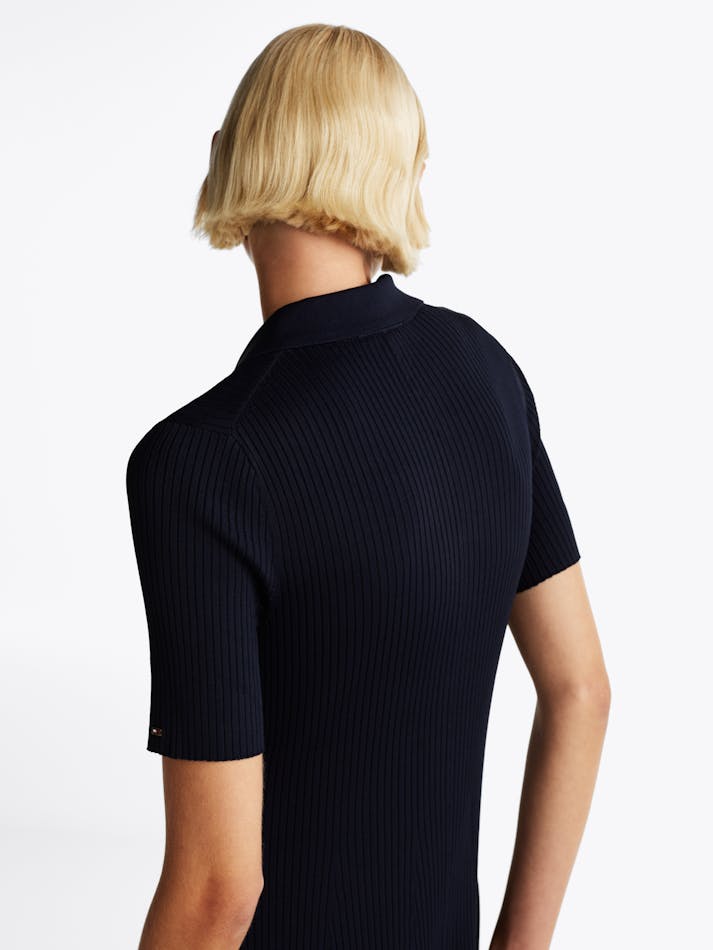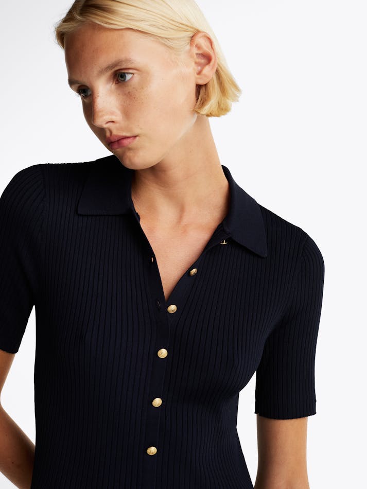 This flattering polo dress is cut to a fit-and-flare silhouette and accented with embossed metallic buttons for a statement finish.