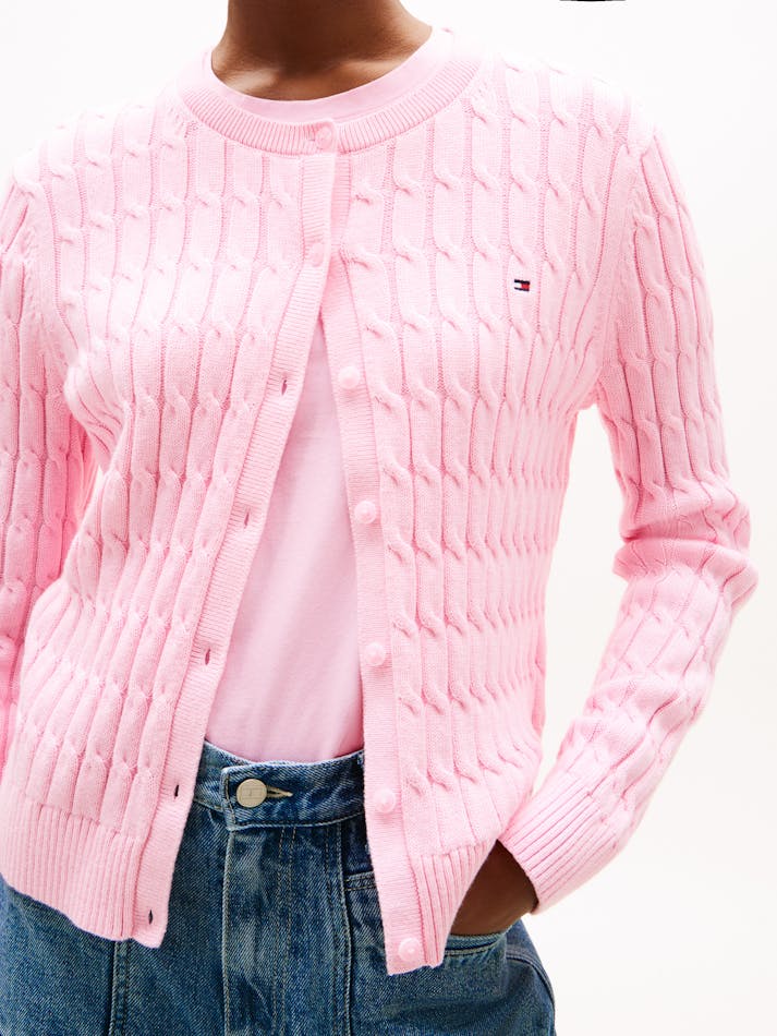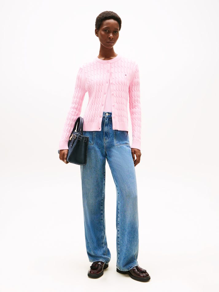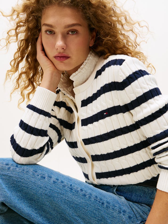 A nod to timeless style, this cardigan features a cosy fit and classic cable knit. The subtle flag embroidery adds a refined touch, perfect for layering over any look.