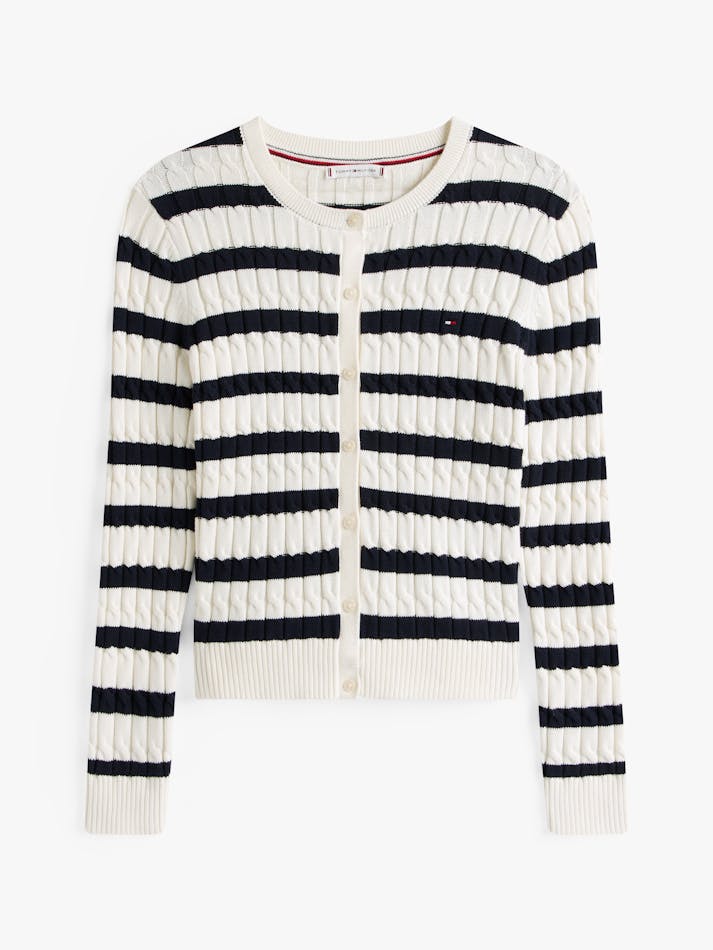 A nod to timeless style, this cardigan features a cosy fit and classic cable knit. The subtle flag embroidery adds a refined touch, perfect for layering over any look.