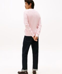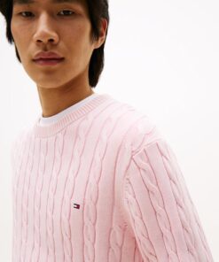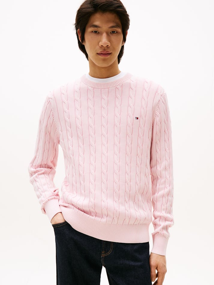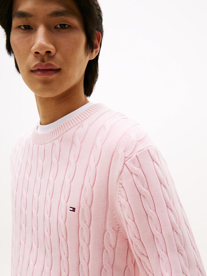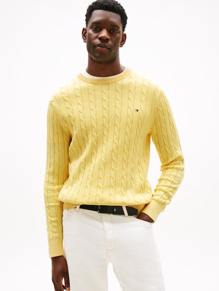 For that lived-in look, turn to our garment-dyed range. The colour is applied after the clothes have been constructed for a vintage appearance. This classic jumper features an intricate cable-knit design with flag embroidery and is garment-dyed for a washed-out look.