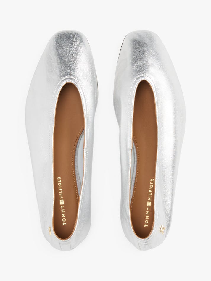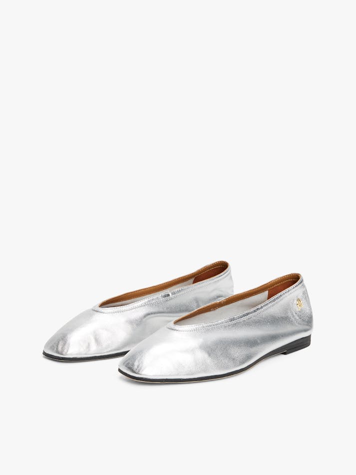 A metallic finish and squared toe bring a sleek, modern freshness to the classic femininity of these soft leather ballerinas.