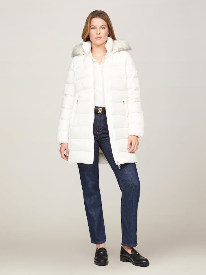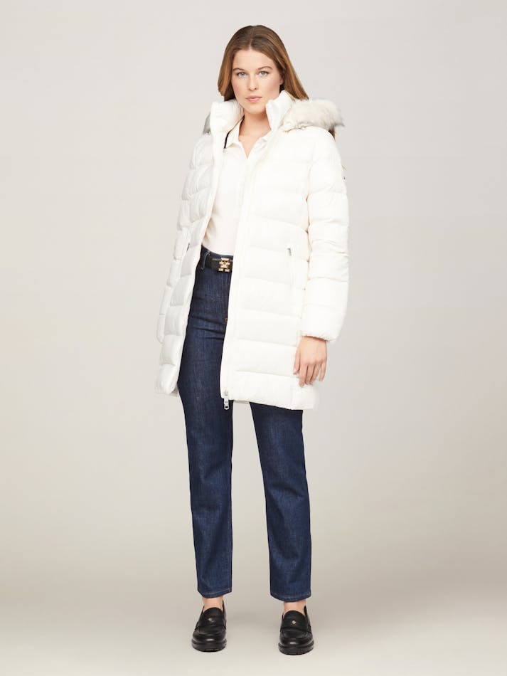 Dash out into the rain with chic pieces from the Water Repellent collection. A glossy, water-repellent finish and a removable faux fur trim on the hood amps up the glamour of this practical down-filled coat.