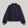 Embrace the classic varsity look with this sleek bomber jacket featuring striped cuffs and a statement logo on the back.