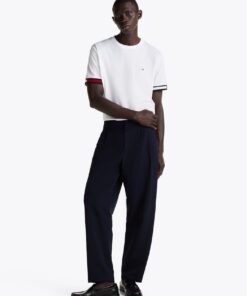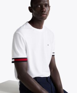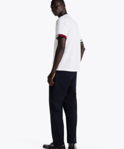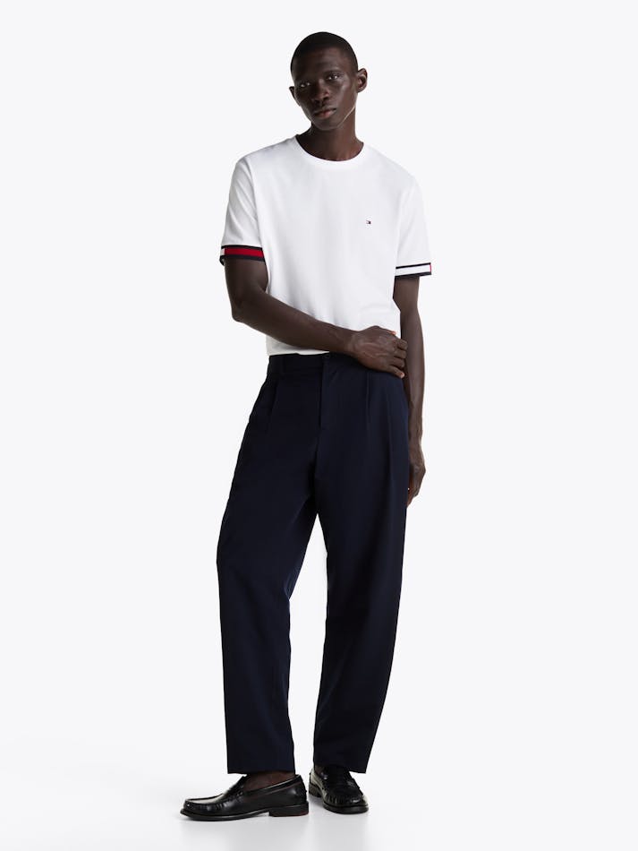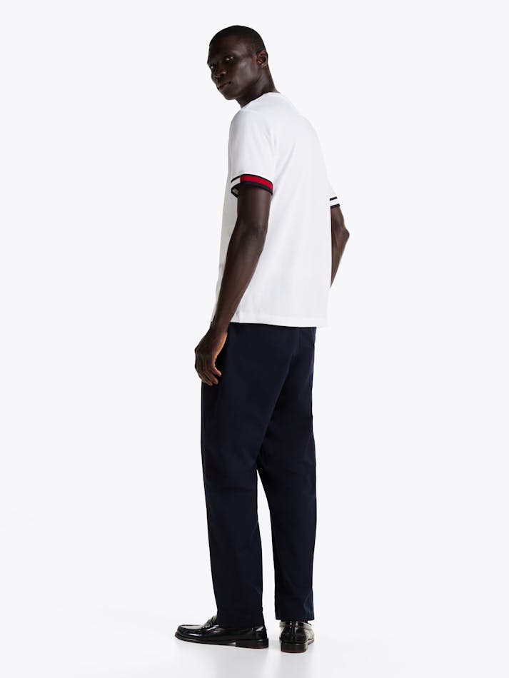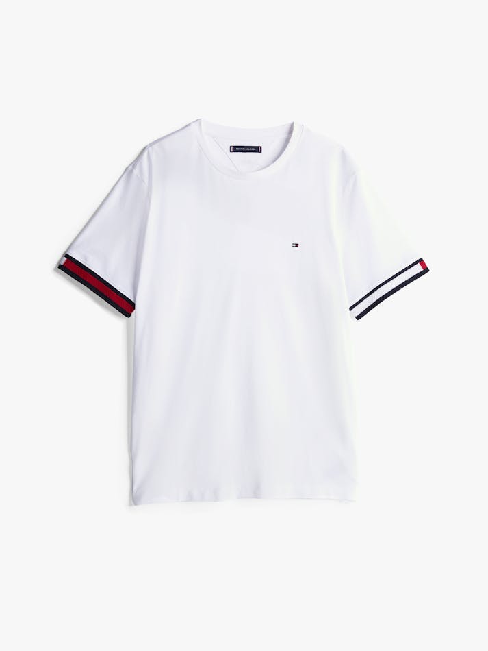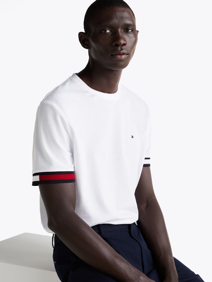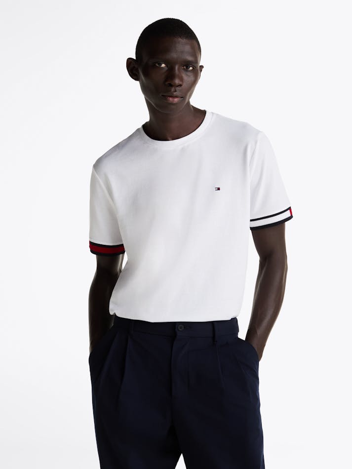 Elevate your weekend looks with this sleek cotton T-shirt, designed with contrasting global stripes on the cuffs and subtle branding.