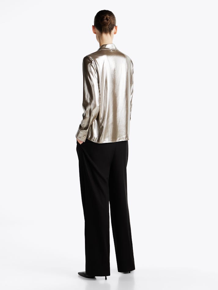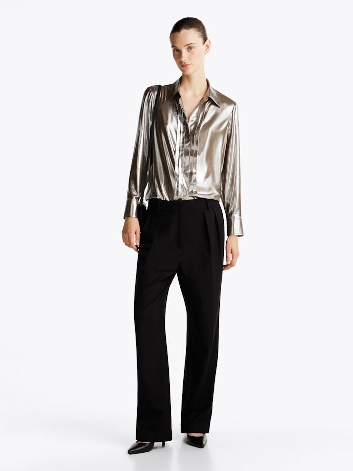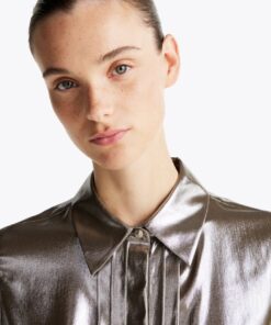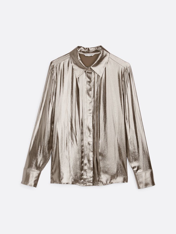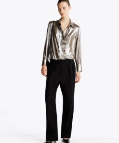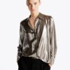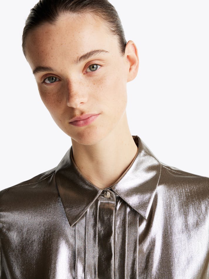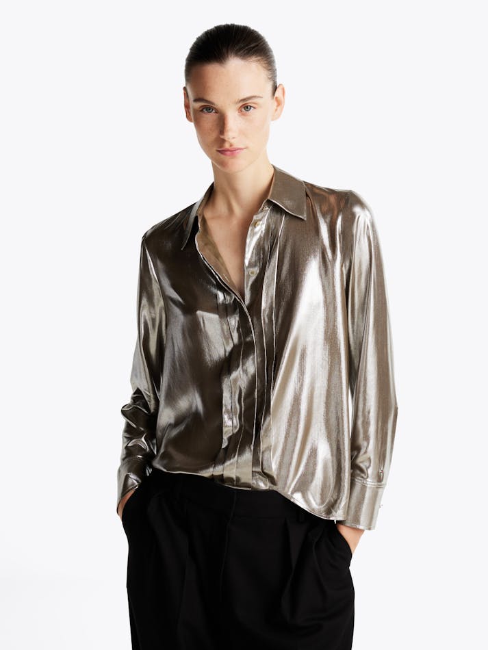 Make an entrance with this metallic lame shirt. Its sleek design is elevated by the pleated details on the front and enamel flag plaque on the cuff.