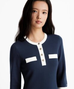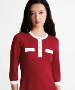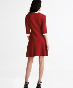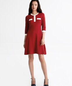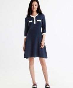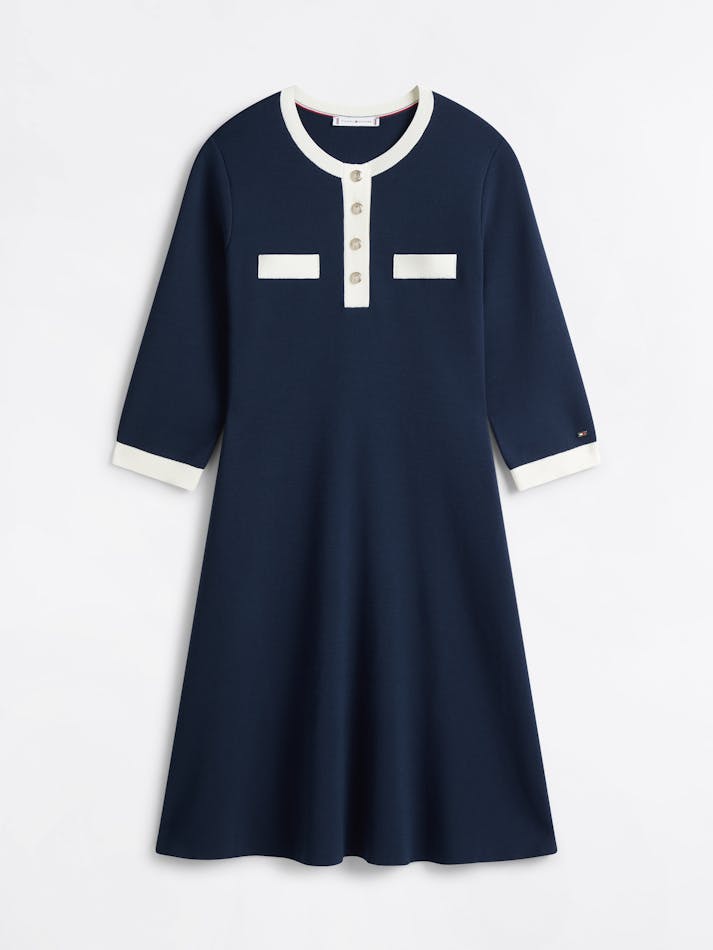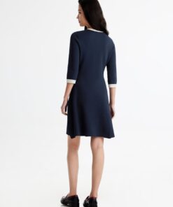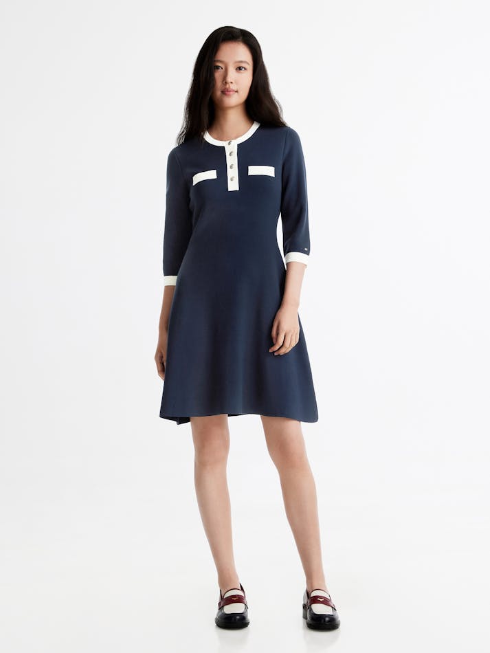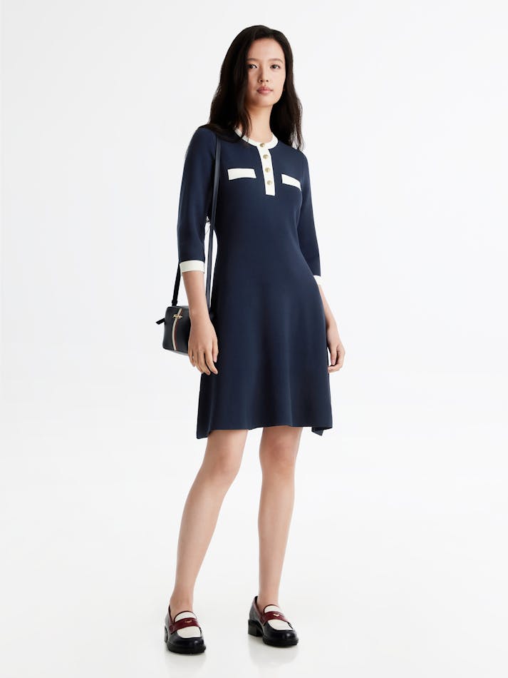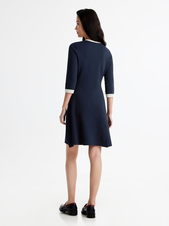 This chic fit-and-flare sweater dress features a flattering silhouette with a crew neck and 3/4 length sleeves. Tipped details add a touch of contrast, while the button-up collar offers a stylish finish. Perfect for both casual and dressy occasions.