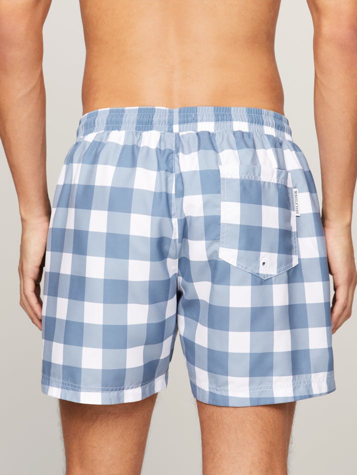 A vintage-inspired gingham check brings a fresh feel to these mid-length swim shorts featuring a comfortable drawstring waist.