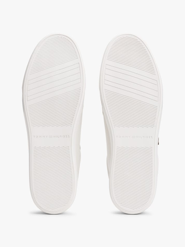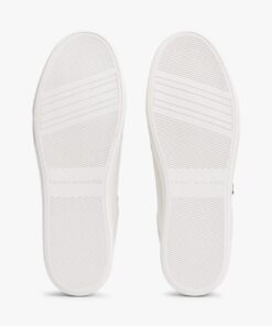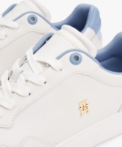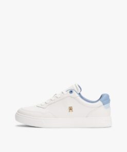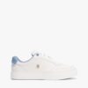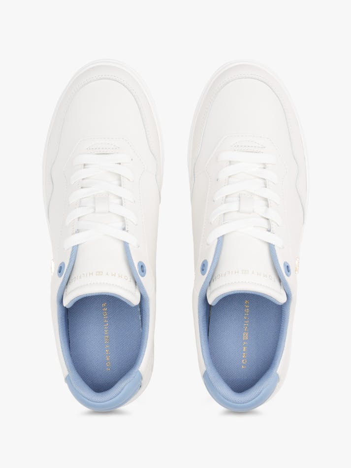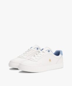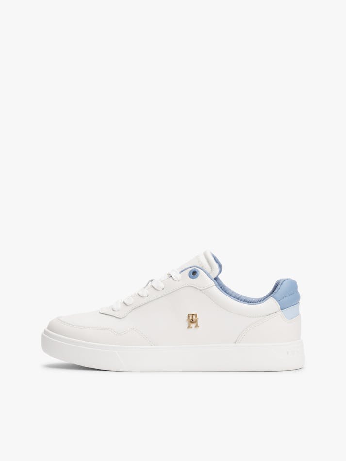 These elevated court trainers showcase gleaming plaque hardware with luxe leather uppers and a colour-pop design on the heels.
