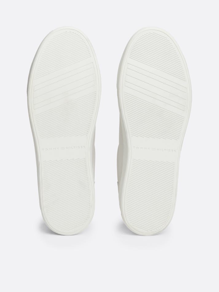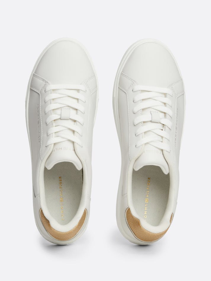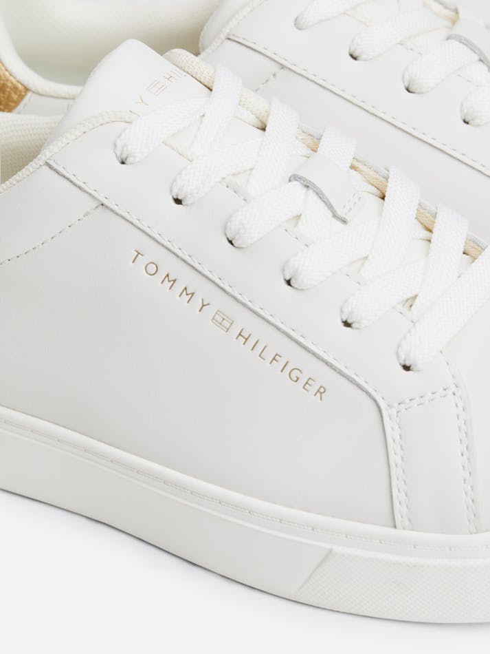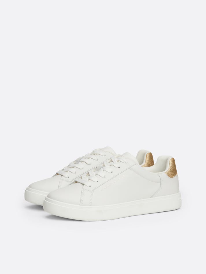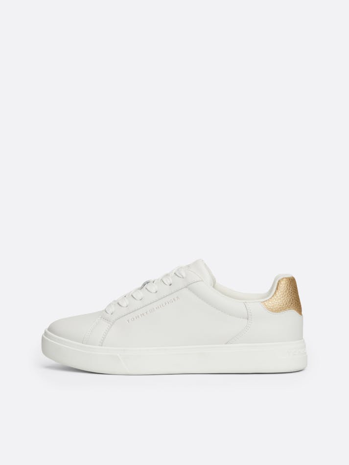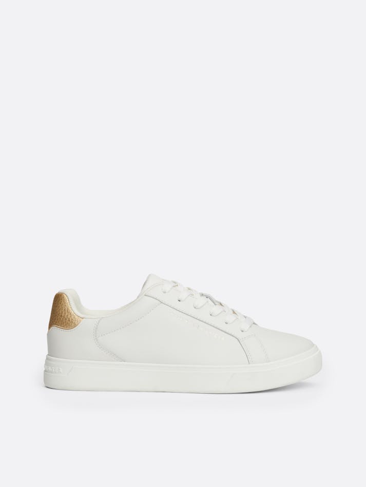 A subtle metallic accent on the heel adds a touch of shine to the fresh, minimalist aesthetic of these leather trainers.