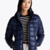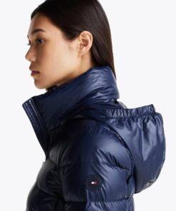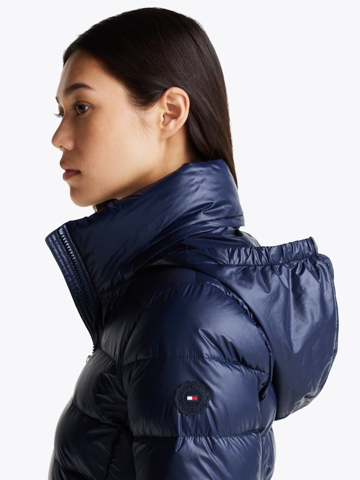 A glossy finish to the water-repellent fabric gives a contemporary look to this lightweight down-filled jacket with a packable hood.
