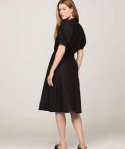 Floaty and breezy, this pure linen shirt dress features a button front, charming puff sleeves and belted tie waist to accentuate the flattering silhouette.