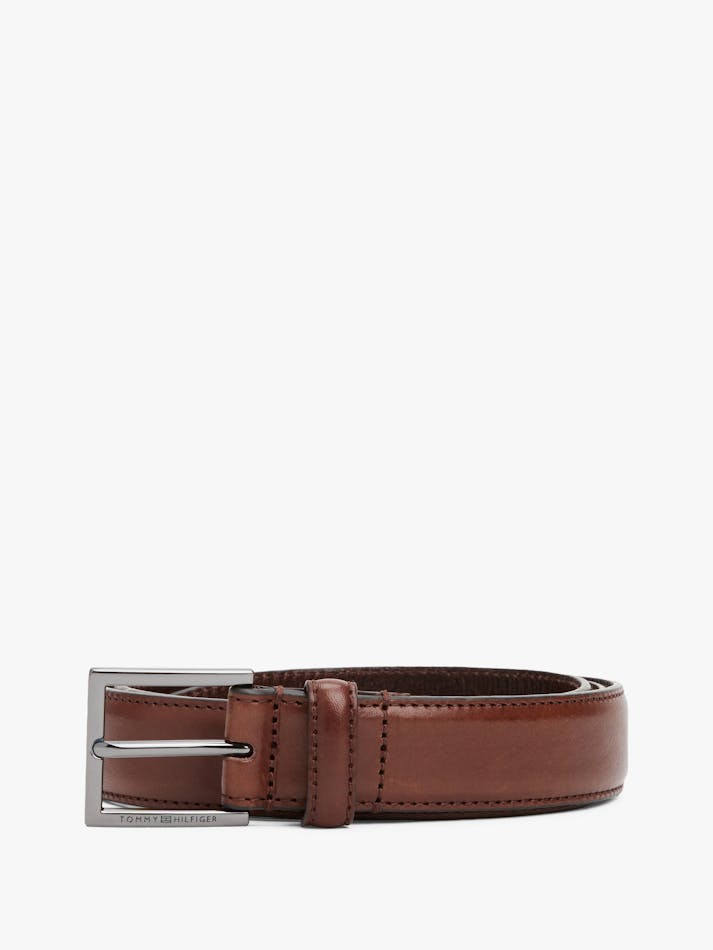 Add a sophisticated touch to any outfit with this shiny leather belt featuring a square metal buckle and a debossed logo.