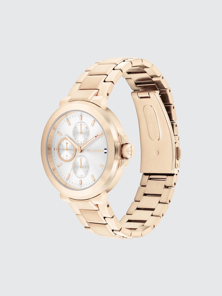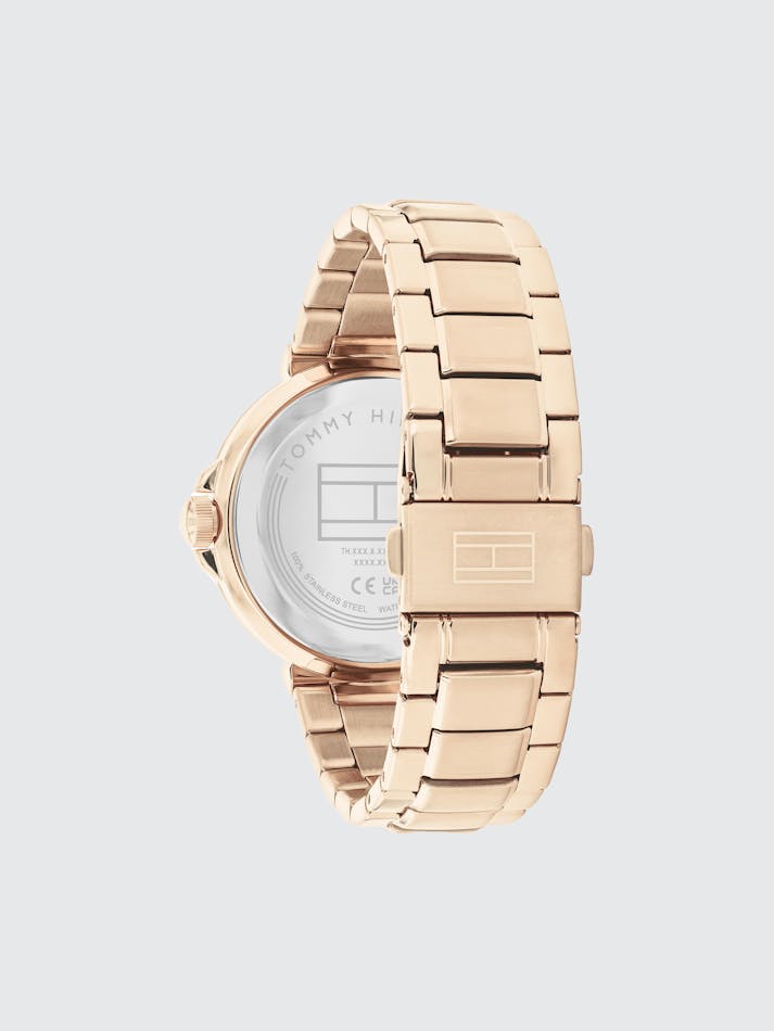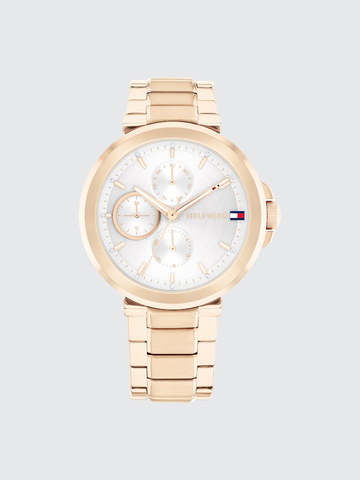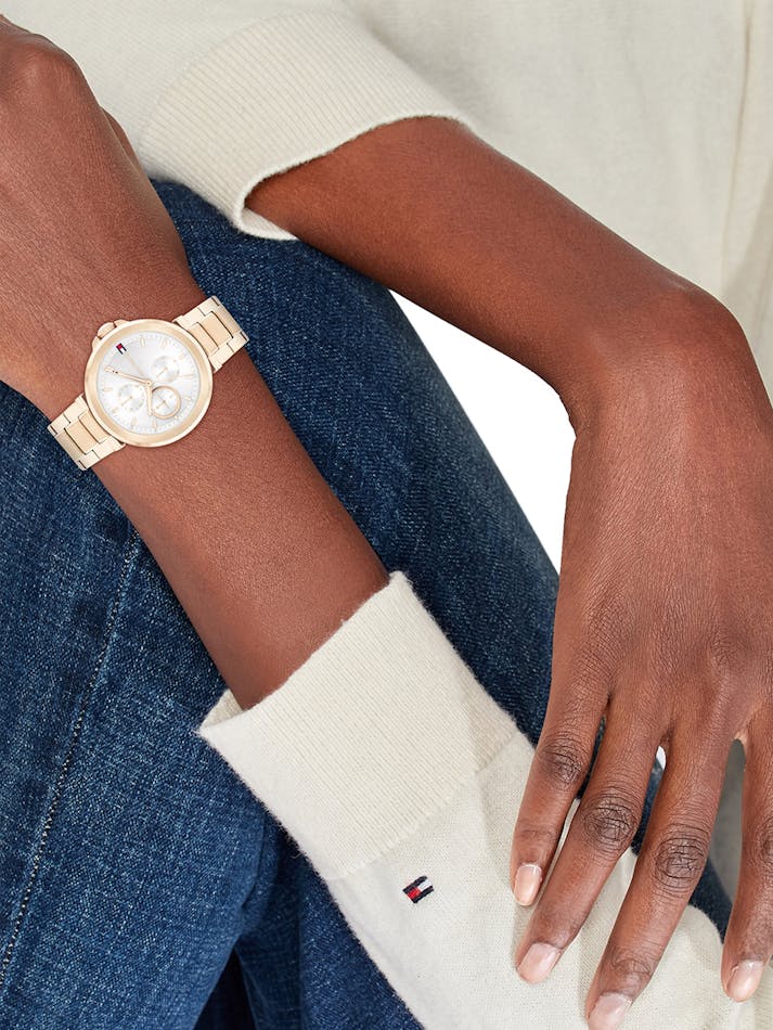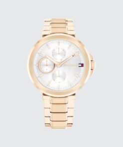 Introducing the epitome of modern sophistication: the Tommy Hilfiger watch, where contemporary style meets timeless elegance. At its heart lies a circular brushed sunray dial, exuding a subtle yet captivating charm. Fine CD-textured sub-eyes add depth and character, while applied indexes and crystal markers elevate its aesthetic appeal to new heights of luxury. Designed with meticulous attention to detail, its T Bar construction seamlessly integrates with the bracelet, ensuring a sleek and cohesive look that effortlessly transitions from day to night. Elevate your ensemble and make a statement that transcends time.