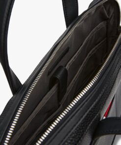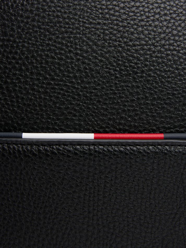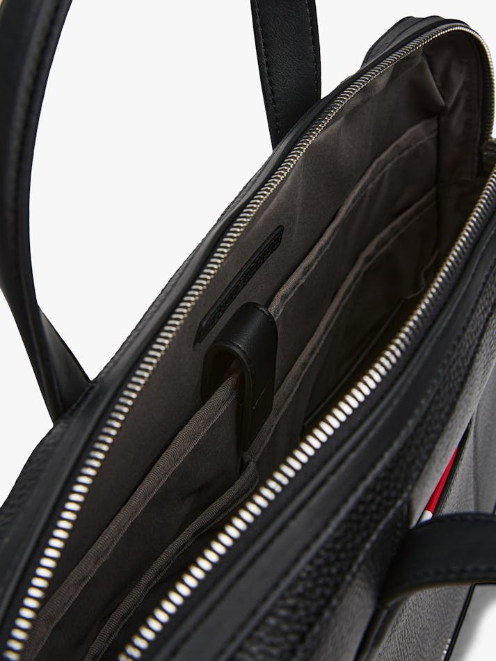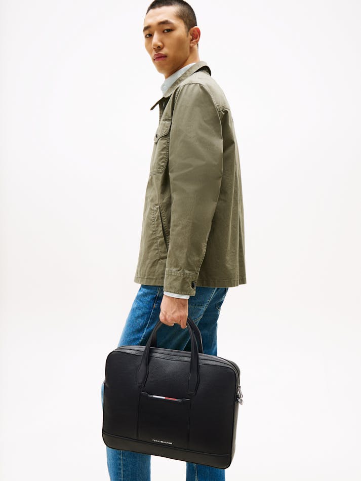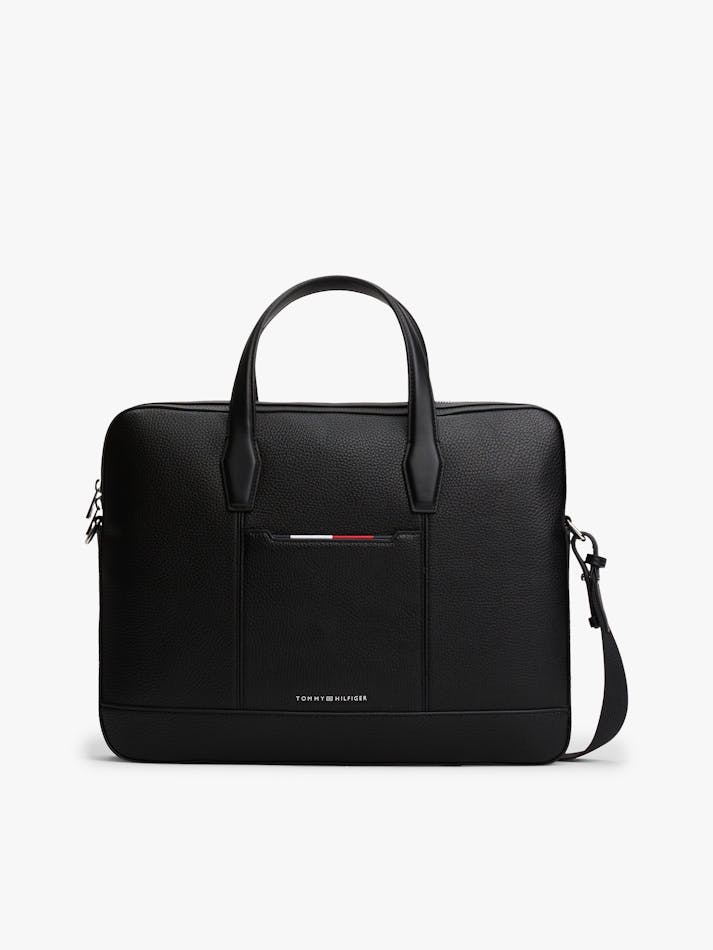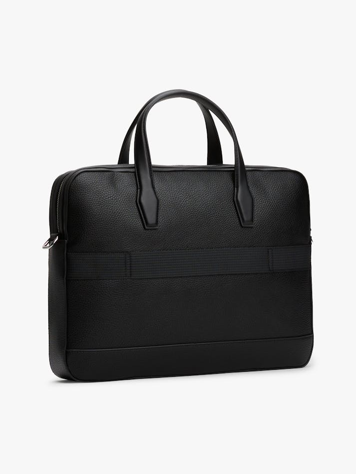 Transport your laptop in style with this smart bag, featuring a luxurious pebble-grain finish and an adjustable webbing strap.