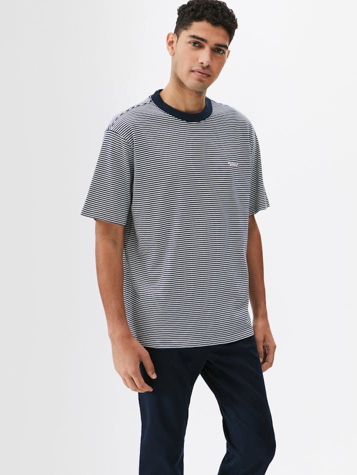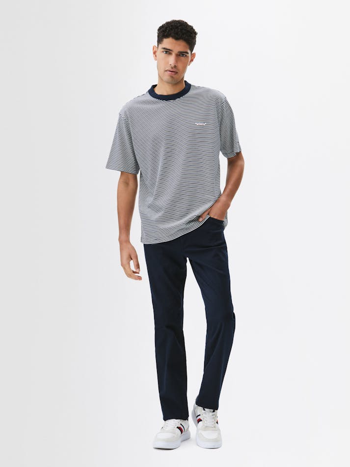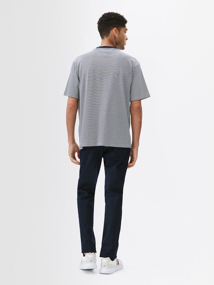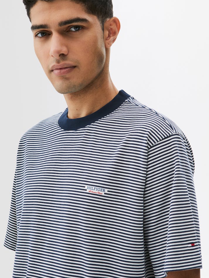 With its all-over stripes and classic crew neckline, this pure cotton tee delivers both comfort and style, featuring a Tommy Hilfiger logo print on the chest for a signature finish.