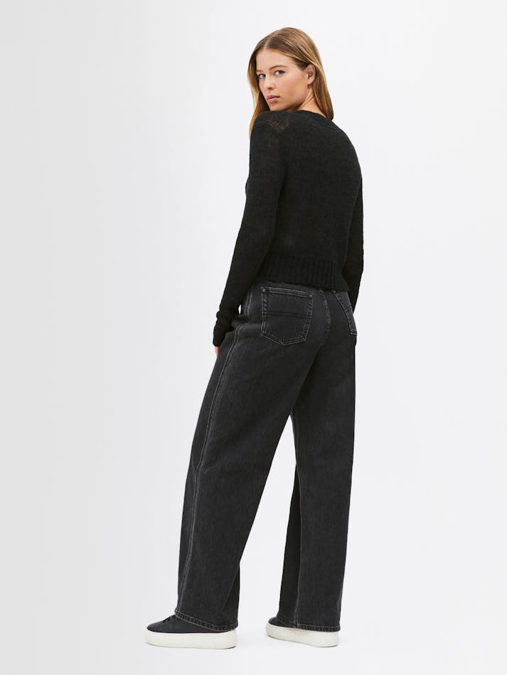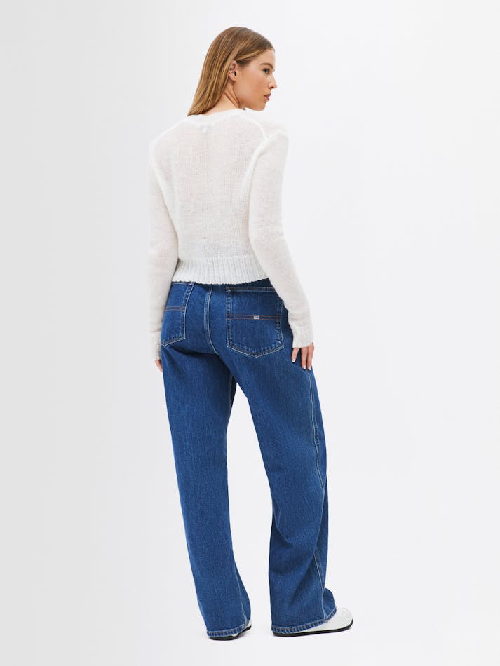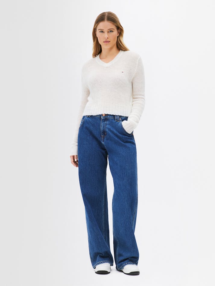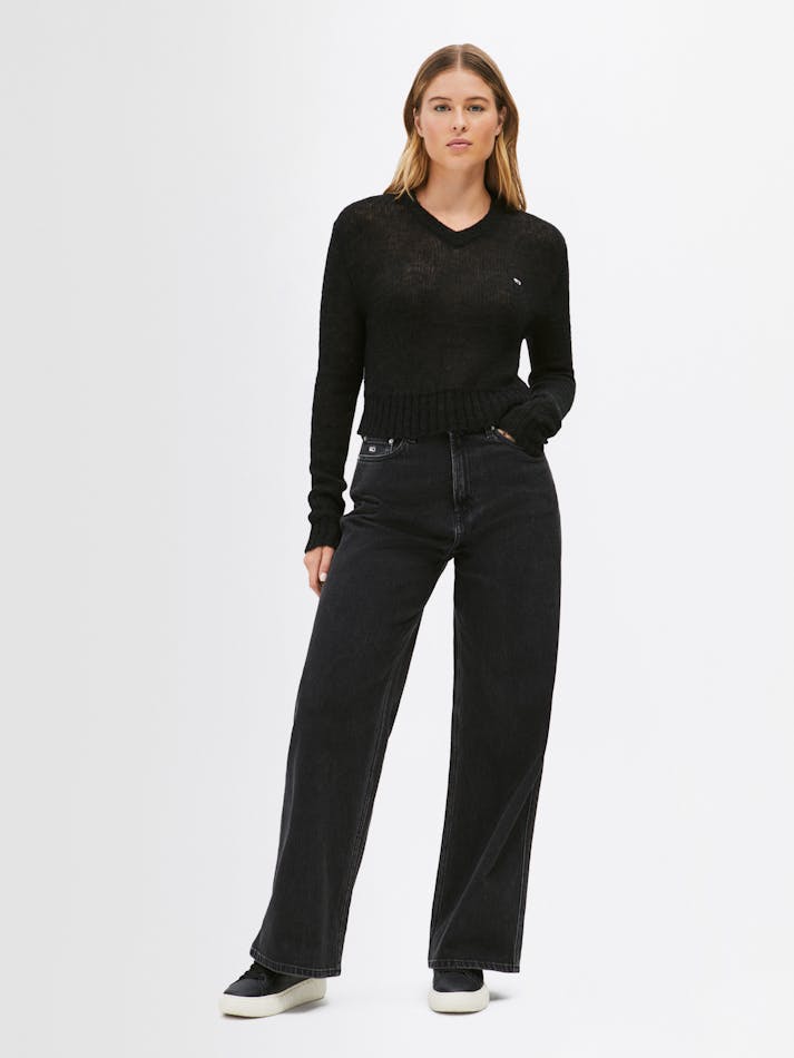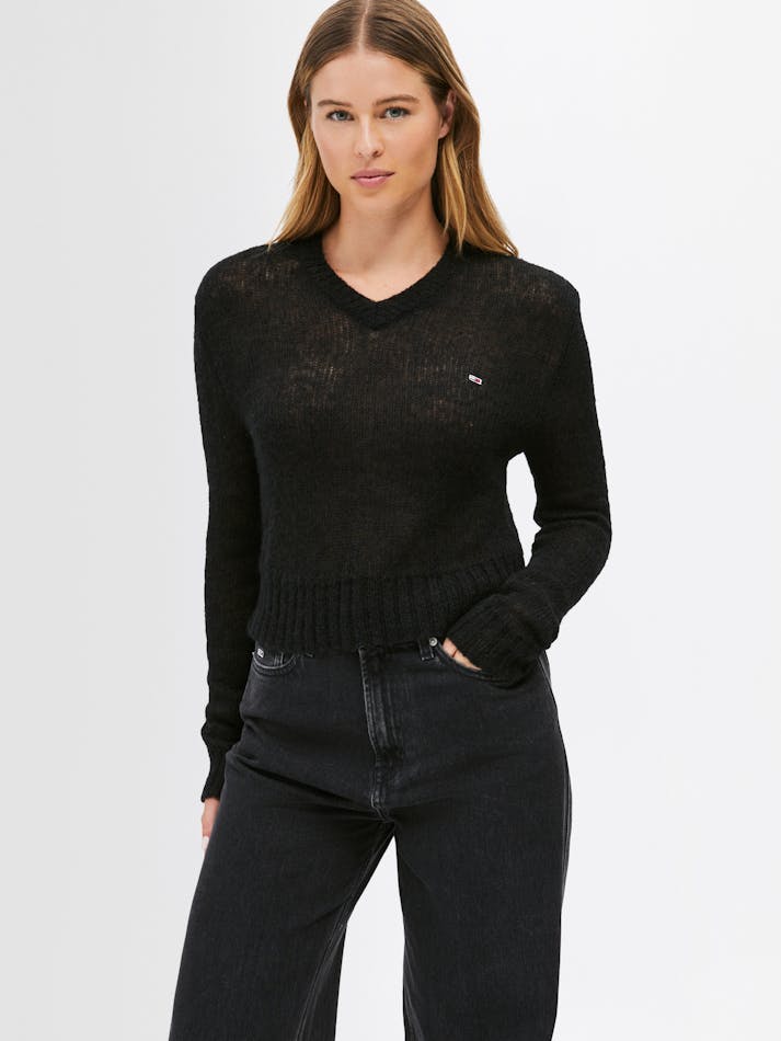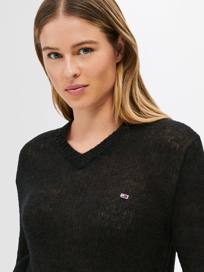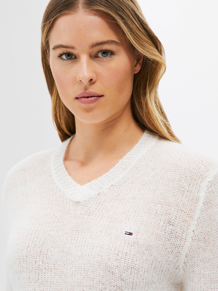 The open knit creates a sheer effect in this wool sweater, complemented by a classic v-neckline and Tommy Jeans flag embroidery on the chest.