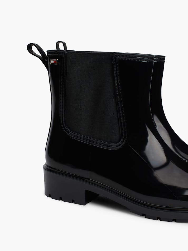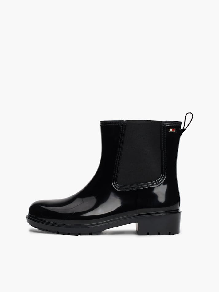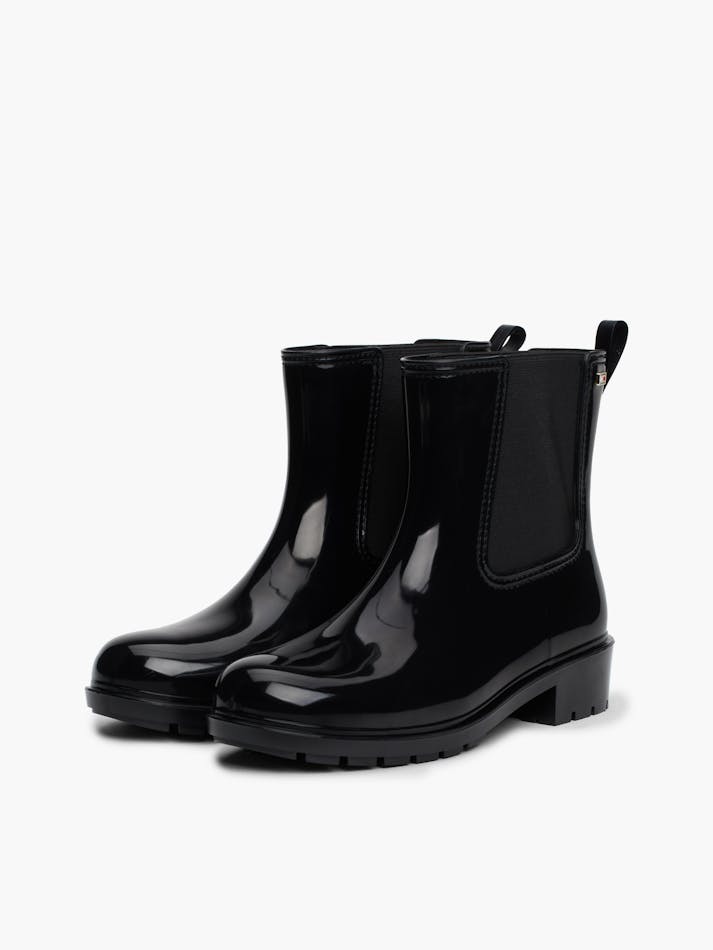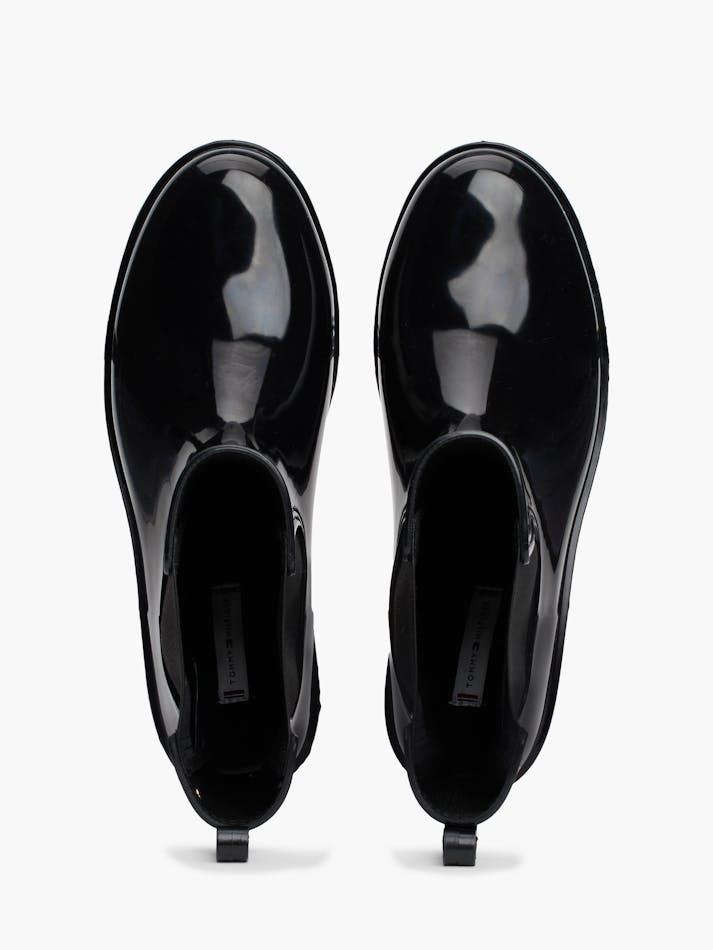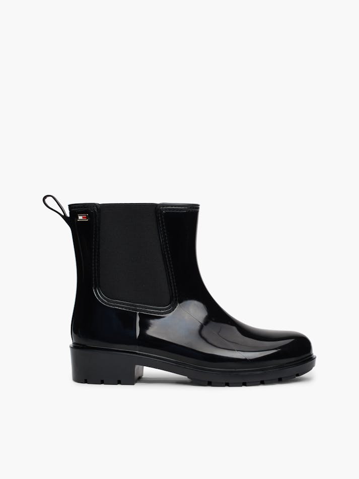 Splash about in style with these patent rain boots, featuring easy elasticated side panels for a classic Chelsea-inspired look.