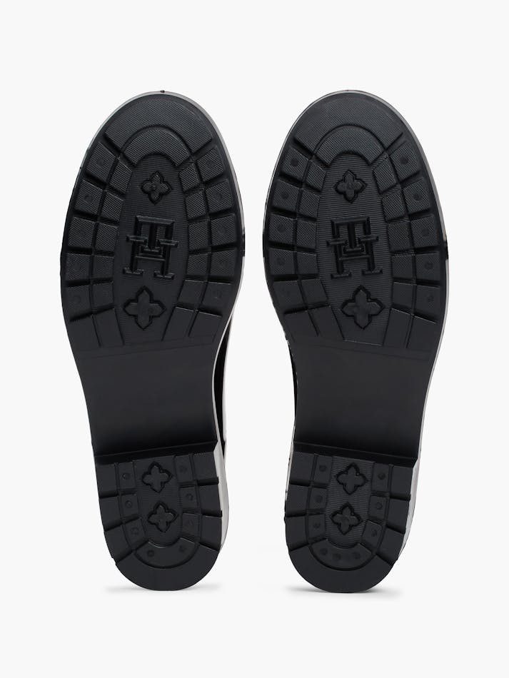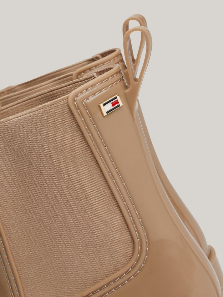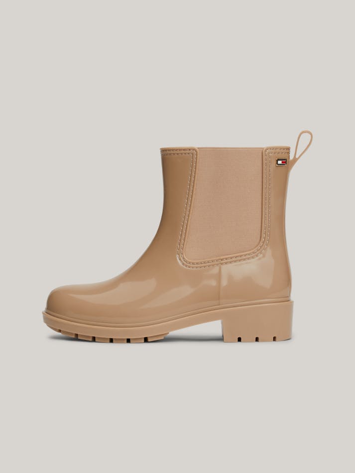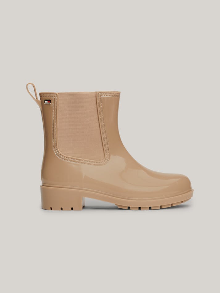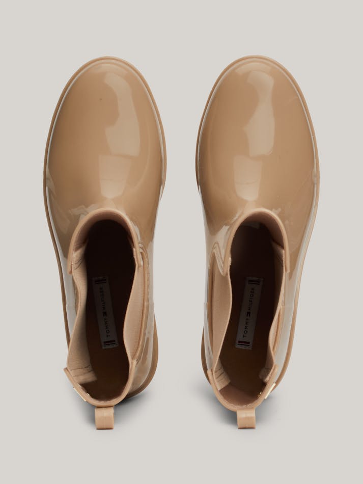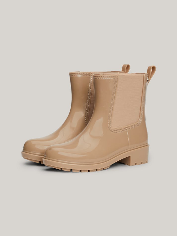 Splash about in style with these patent rain boots, featuring easy elasticated side panels for a classic Chelsea-inspired look.
