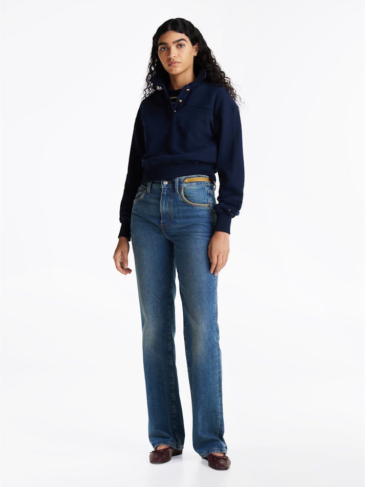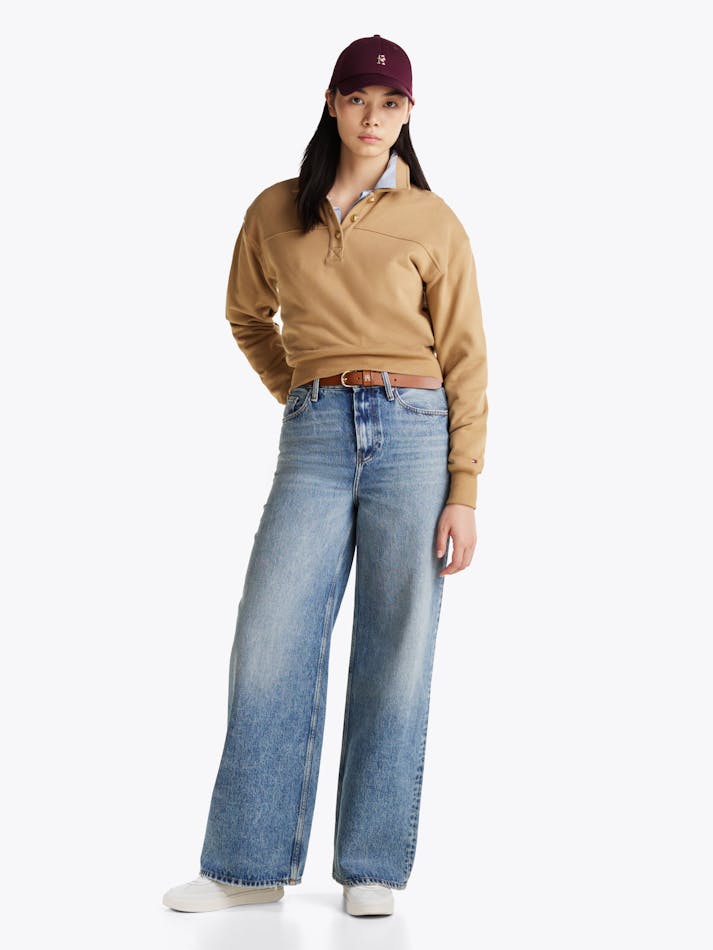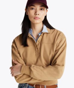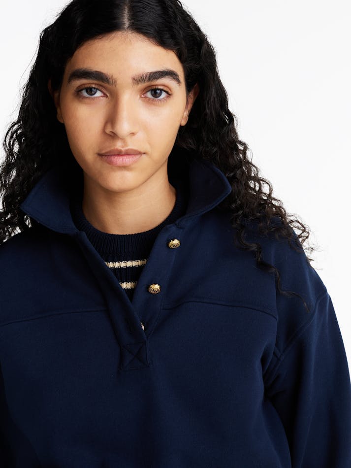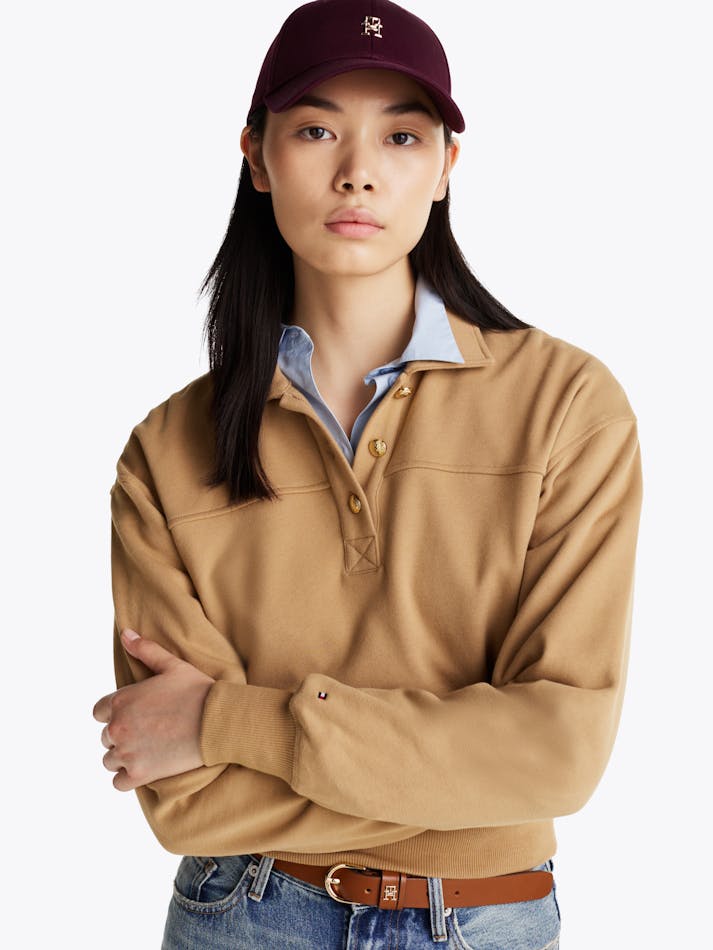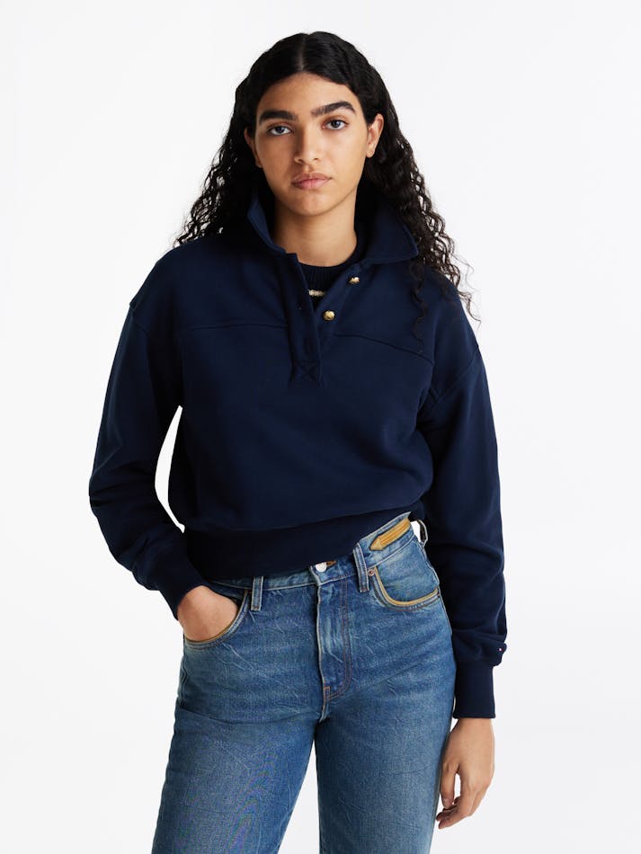 Elevate the basics beyond the ordinary with this sweatshirt that combines a sporty polo collar with elegant gold-tone buttons.