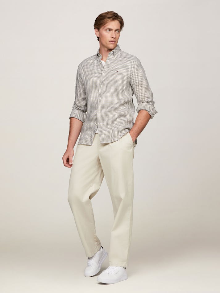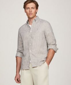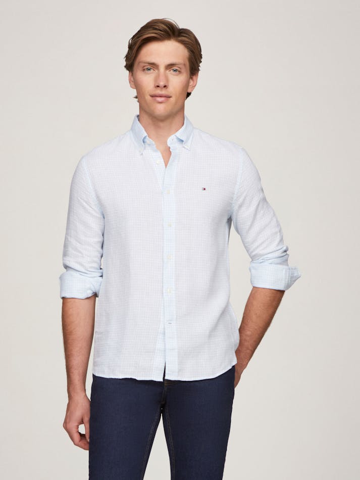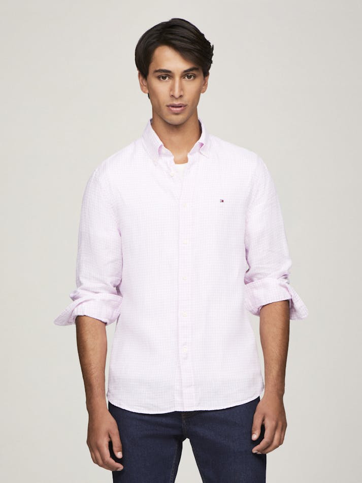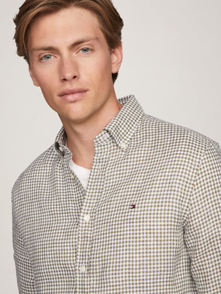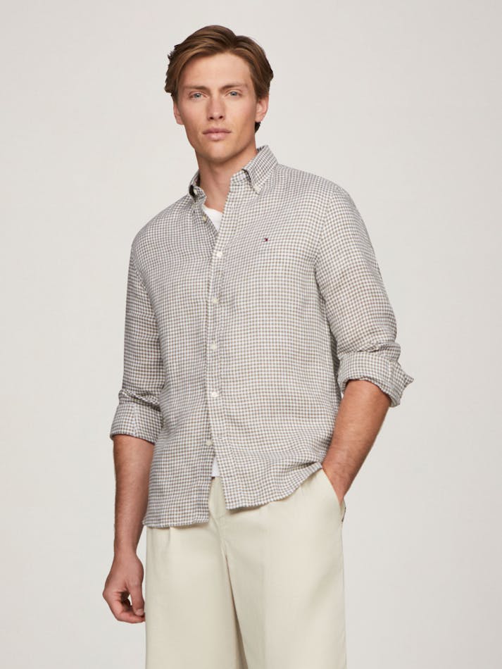 For smart casual-styling, this pure linen shirt is finished with a gingham check and signature flag embroidery on the chest.