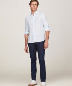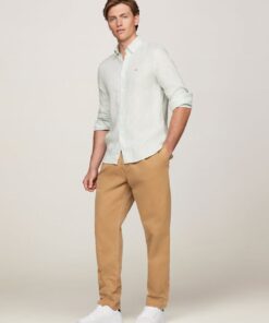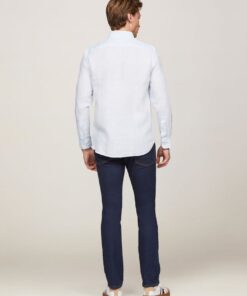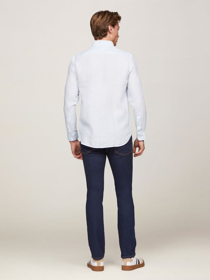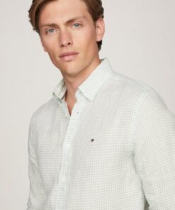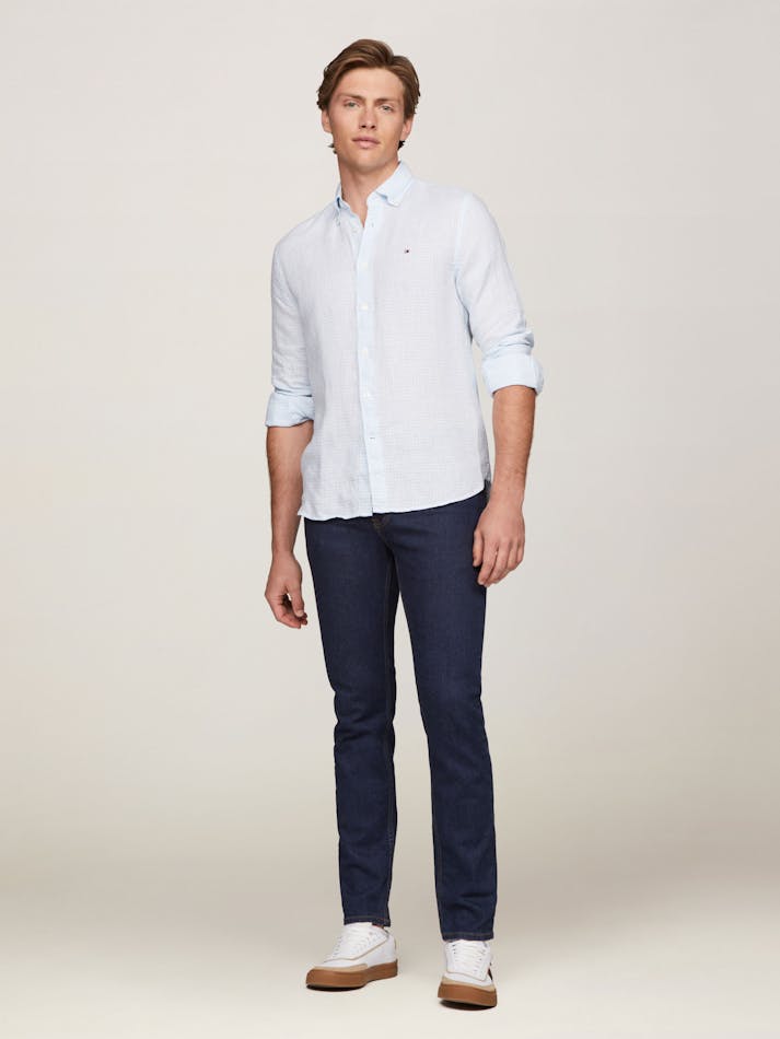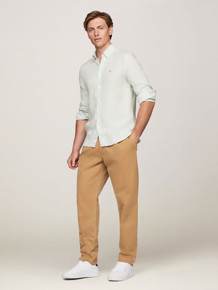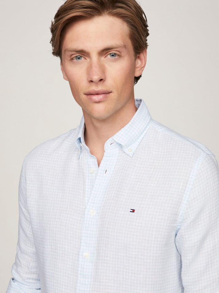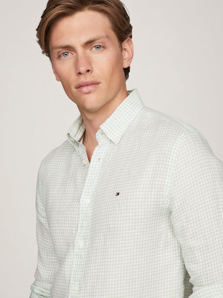 For smart casual-styling, this pure linen shirt is finished with a gingham check and signature flag embroidery on the chest.