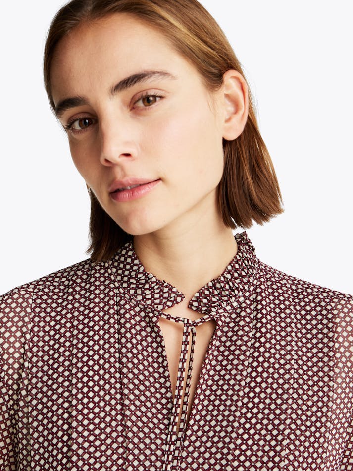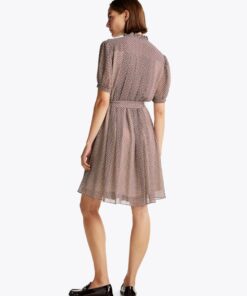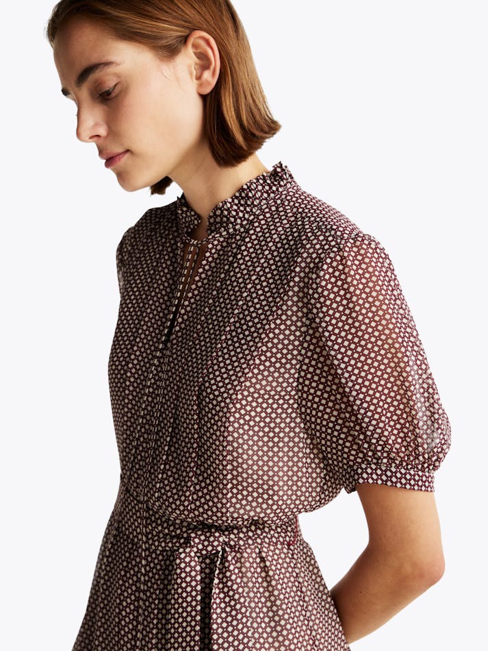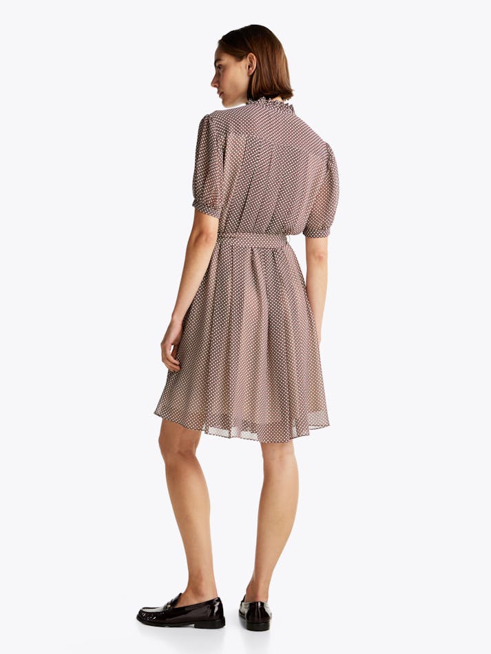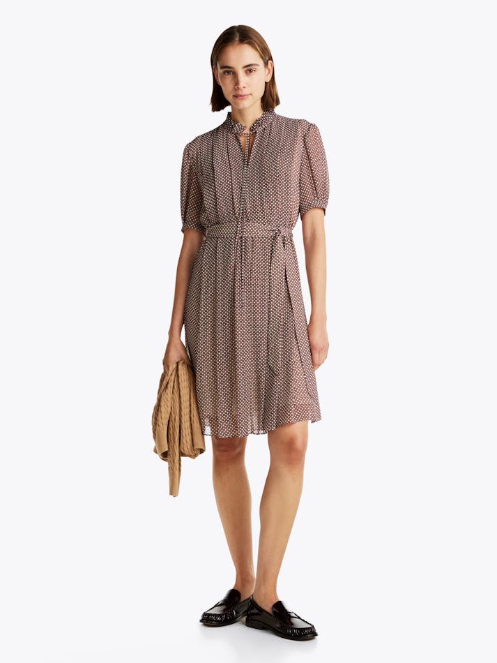 This dress is full of effortlessly feminine charm, with a gathered neckline, waist-cinching self-tie belt and all-over pleating on the printed fabric.
