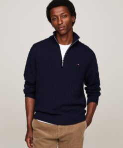 Add a layer of stylish warmth with this cable-knit jumper, crafted from pure wool and featuring a zip-up mock turtleneck.