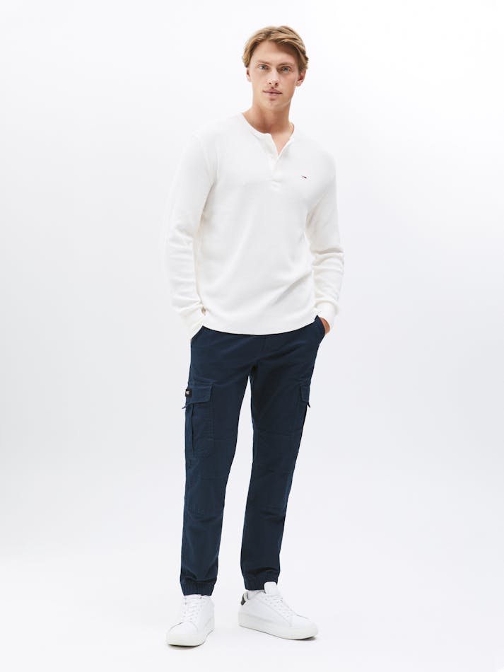 The waffle knit texture brings a cosy feel to this henley neck tee, featuring long sleeves and Tommy Jeans flag embroidery to finish the look.