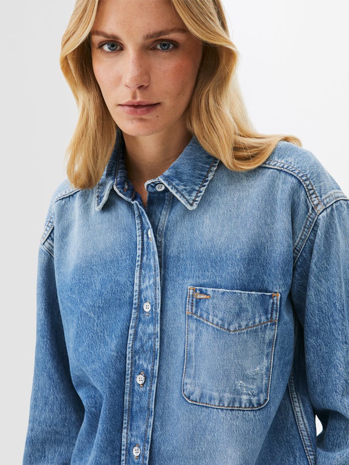 A semi-spread collar and button up front bring classic appeal to this denim shirt, while the distressed chest pocket adds a rugged touch.