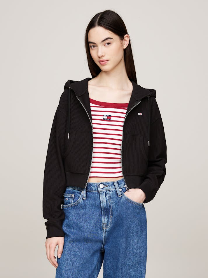 This hoodie adds an effortlessly cool layer to casual outfits, with an elevated ribbed texture and a chic cropped fit.