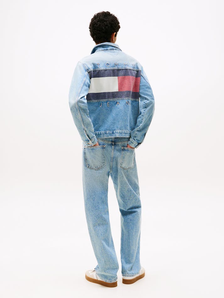 This denim trucker jacket brings retro energy to your look with its classic chest envelope pockets and colour-blocked back logo.