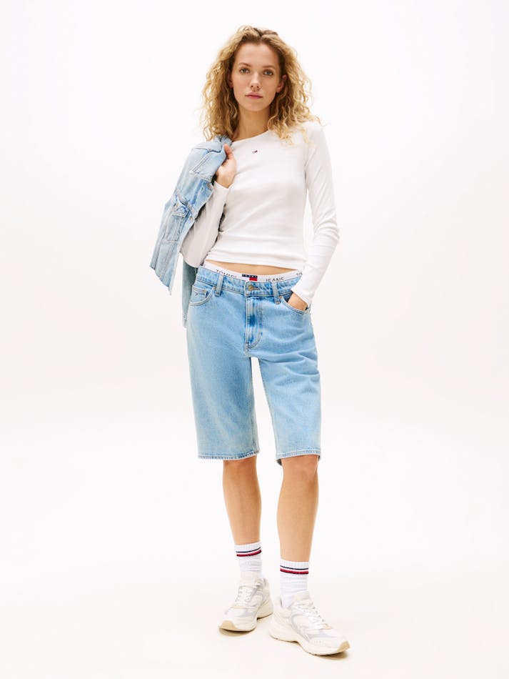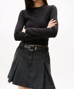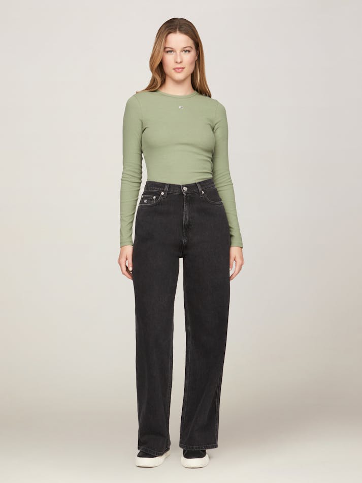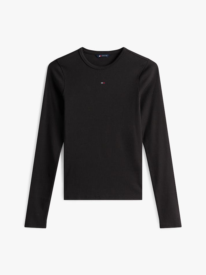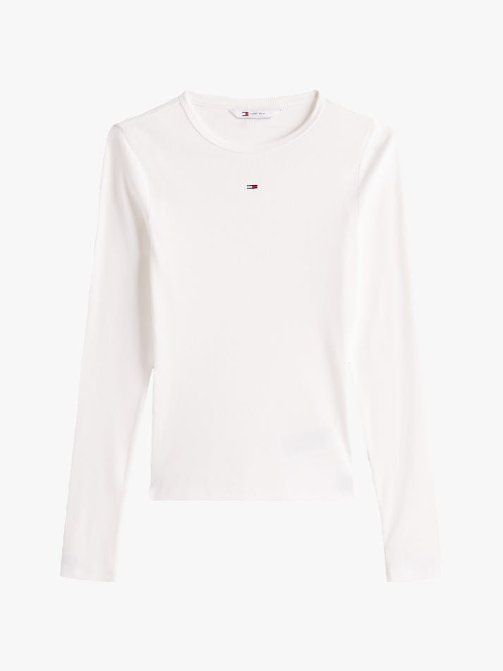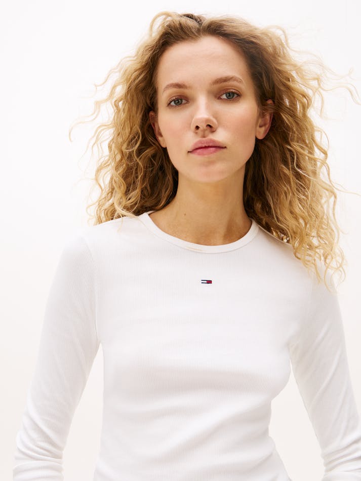 The flattering slim fit gives this essential top timeless appeal, featuring an all-over rib knit and Tommy Jeans flag embroidery on the chest.