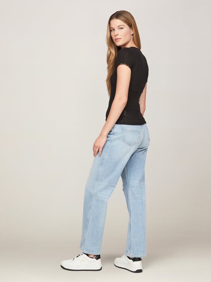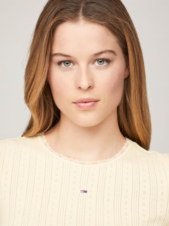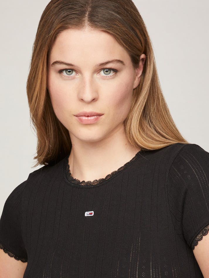 This top combines a round neckline and short sleeves with delicate pointelle rib knit and lace trims for a soft, feminine touch.