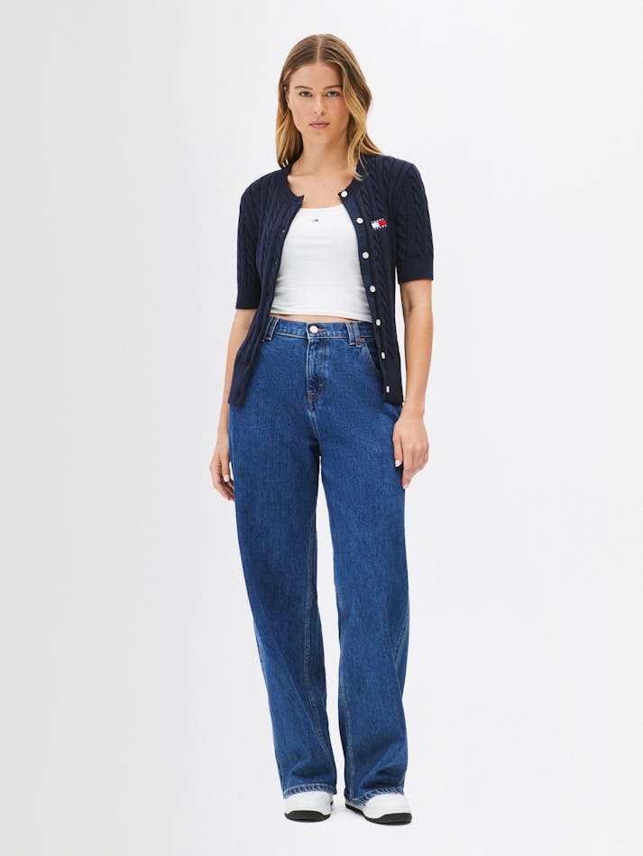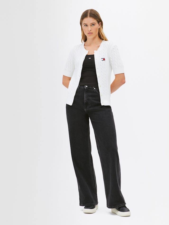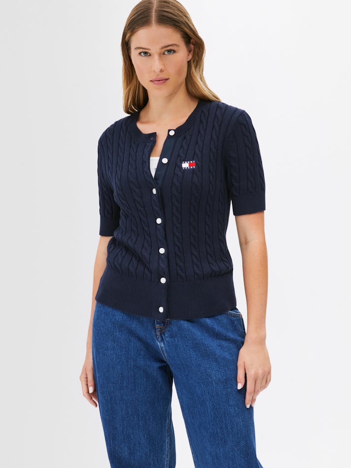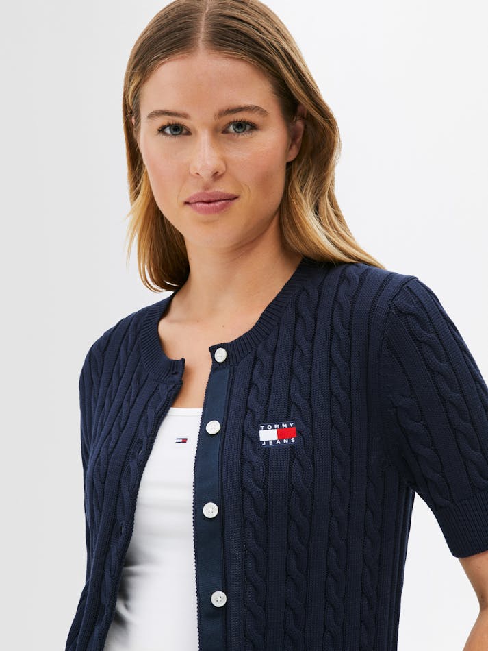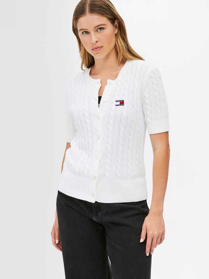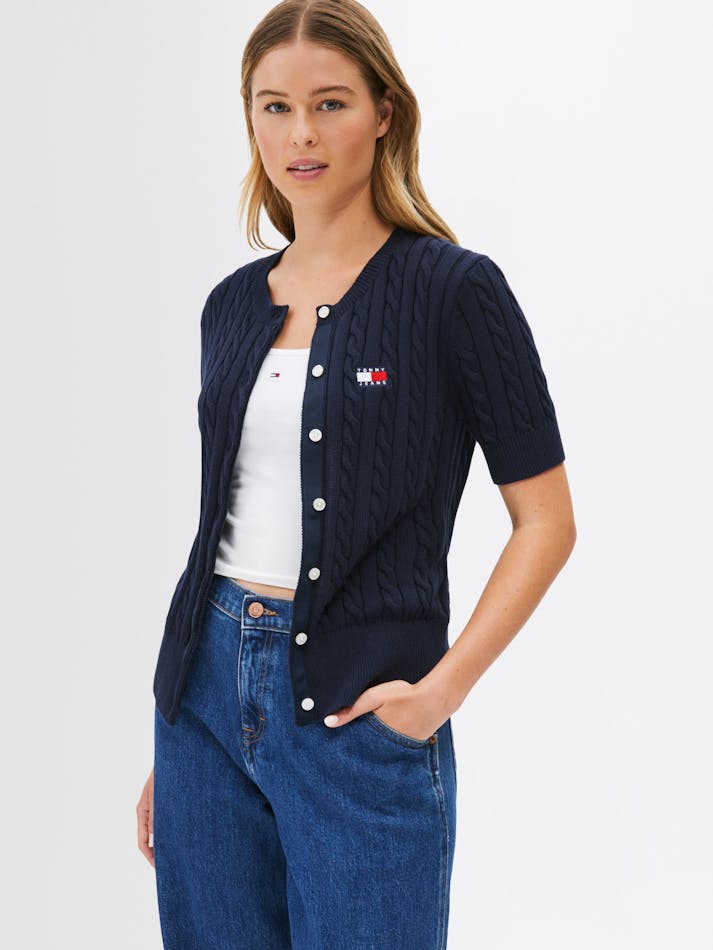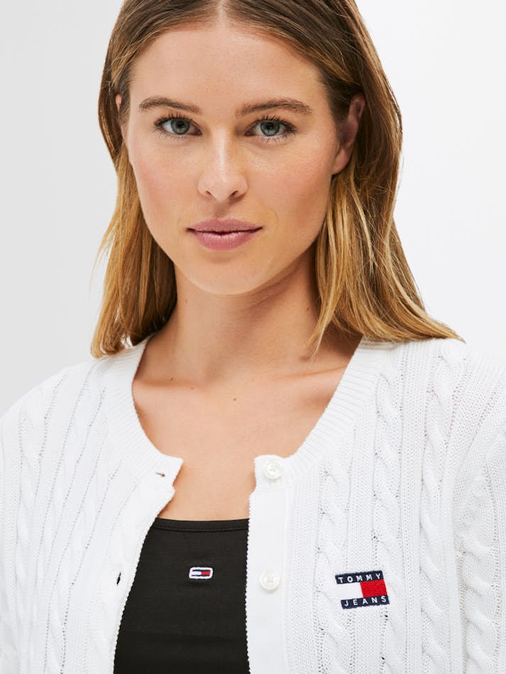 Combining vintage charm with modern comfort, this cardigan is crafted from soft cotton with a button up front and all-over cable knit. The Tommy Jeans badge on the chest adds a preppy touch to this classic knit.