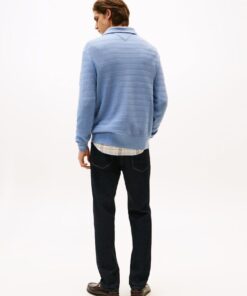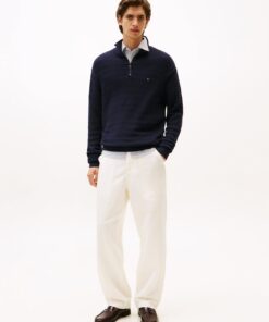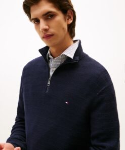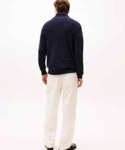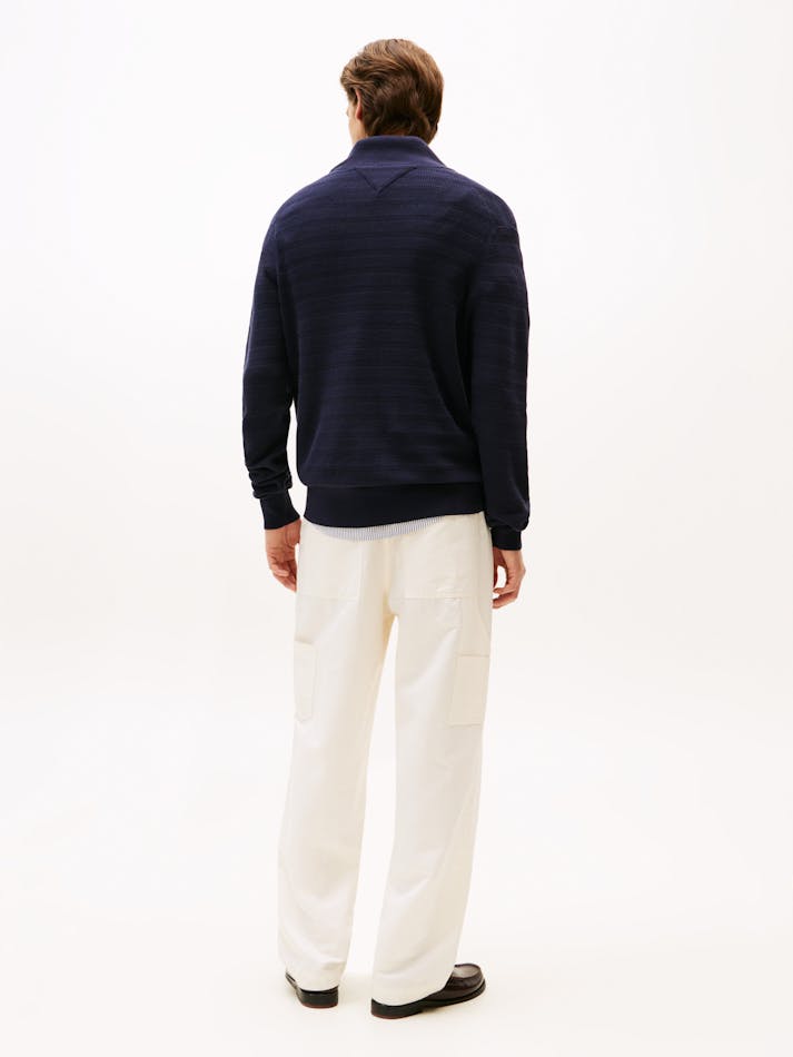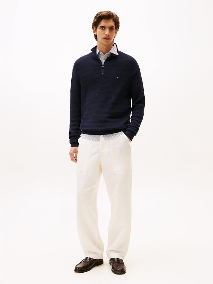 This pure cotton contemporary jumper features a striking textured stripe design, complemented by a quarter-zip neck and rib-knit details.