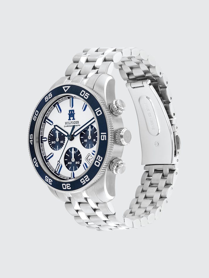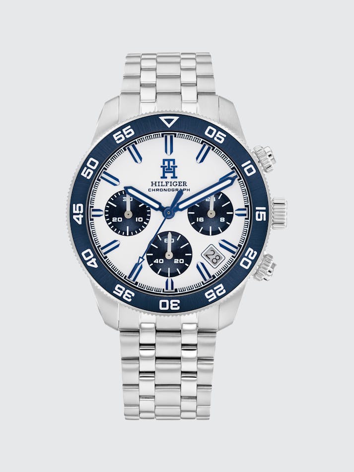 Introducing the ulimate accessory for the modern man – TH 85 Stainless Steel White Dial Watch. Featuring a vibrant blue bezel, white dial display and stainless steel braclet.
