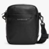 This leather reporter bag, featuring an adjustable crossbody strap and multiple pockets, combines a compact size with practicality and style.