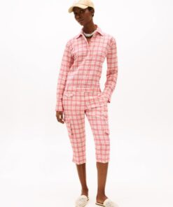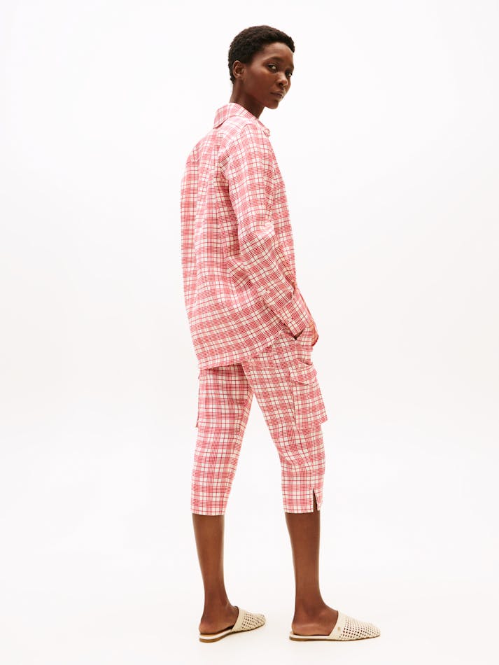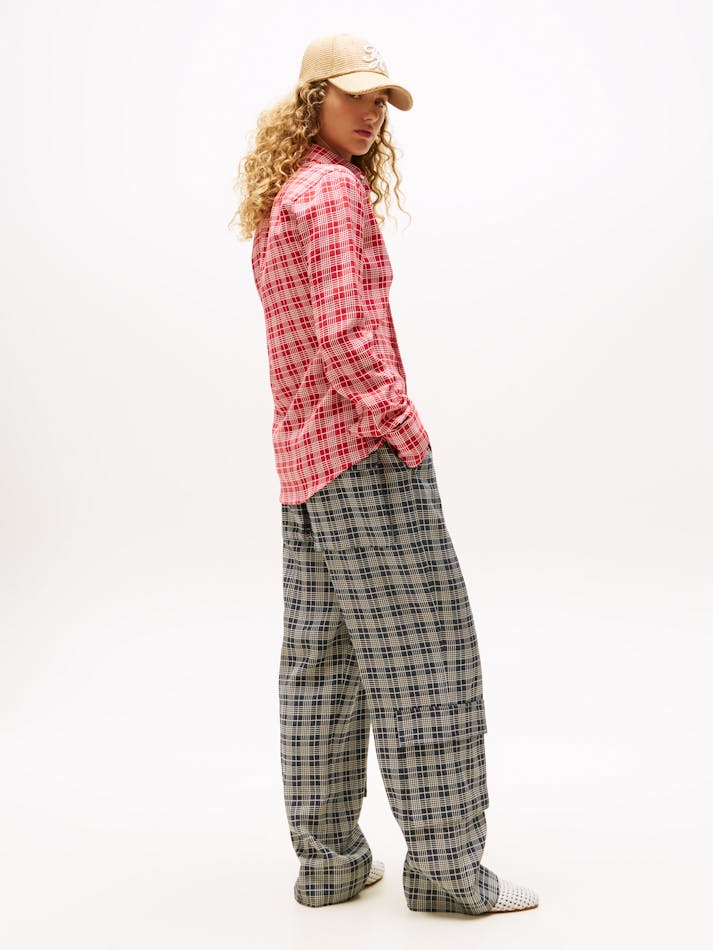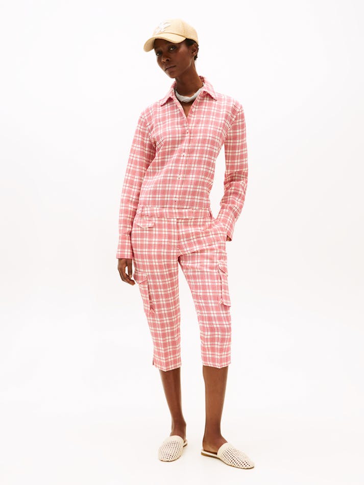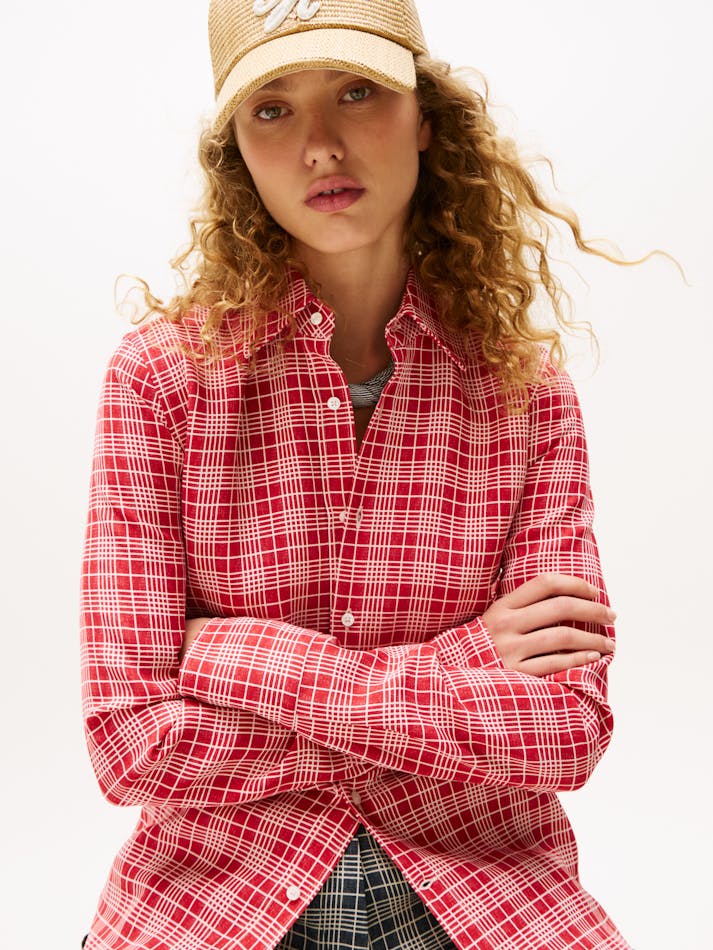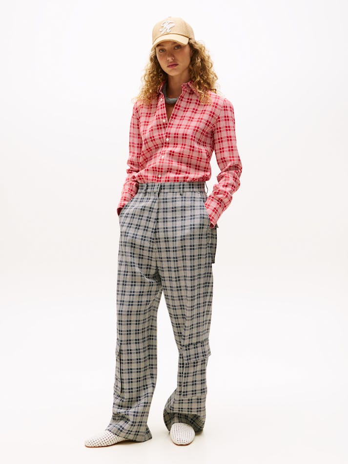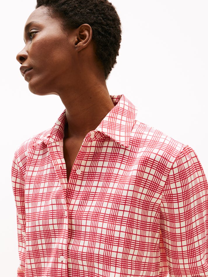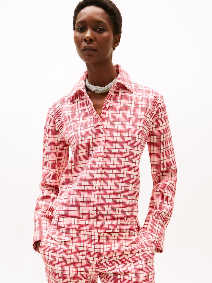 A new American prep wardrobe, presented at New York Fashion Week. Crafted in a luxe silk blend for natural movement, this all-over check shirt is perfect for layering under crisp, structured blazers.