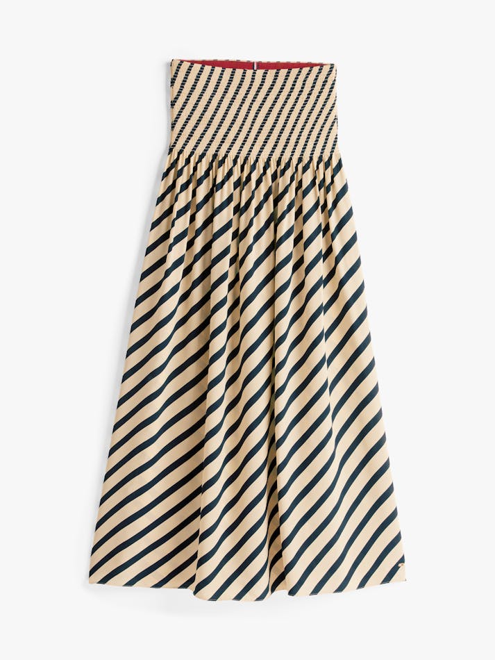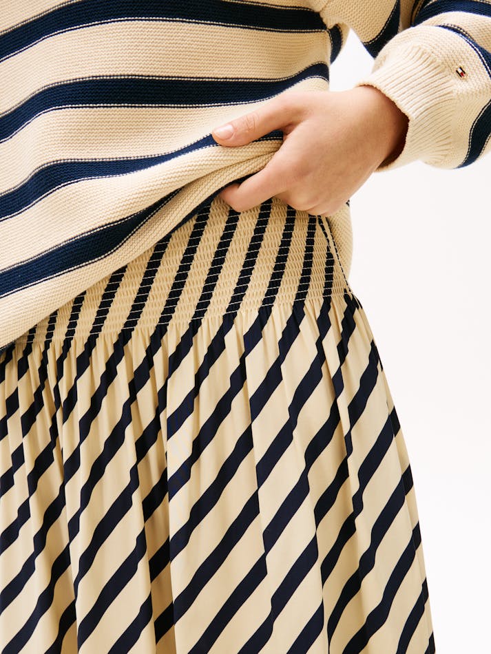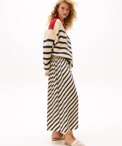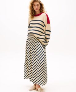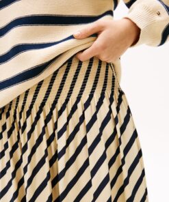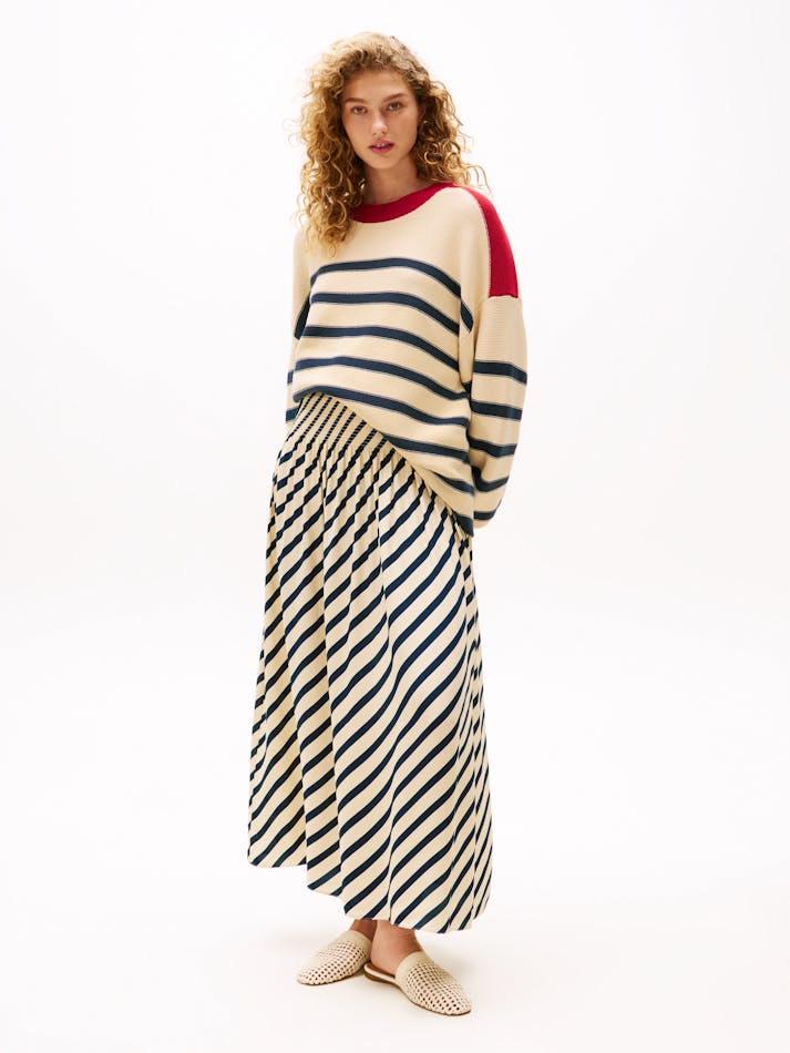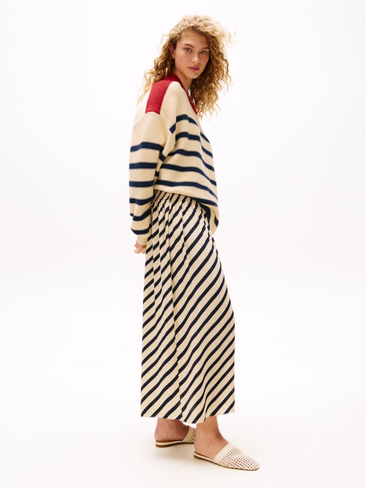 Sofia Richie Grainge lives the everyday twist in Tommy Hilfiger’s most covetable Spring pieces. This maxi skirt boasts a timeless Breton stripe design, complemented by pleating that creates a graceful and flowing silhouette.