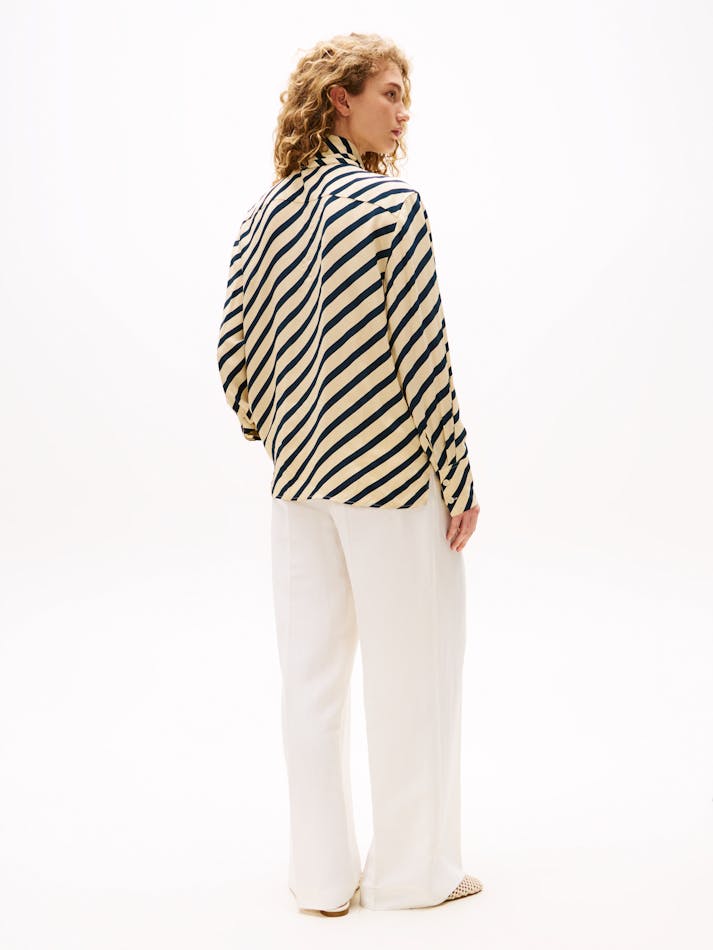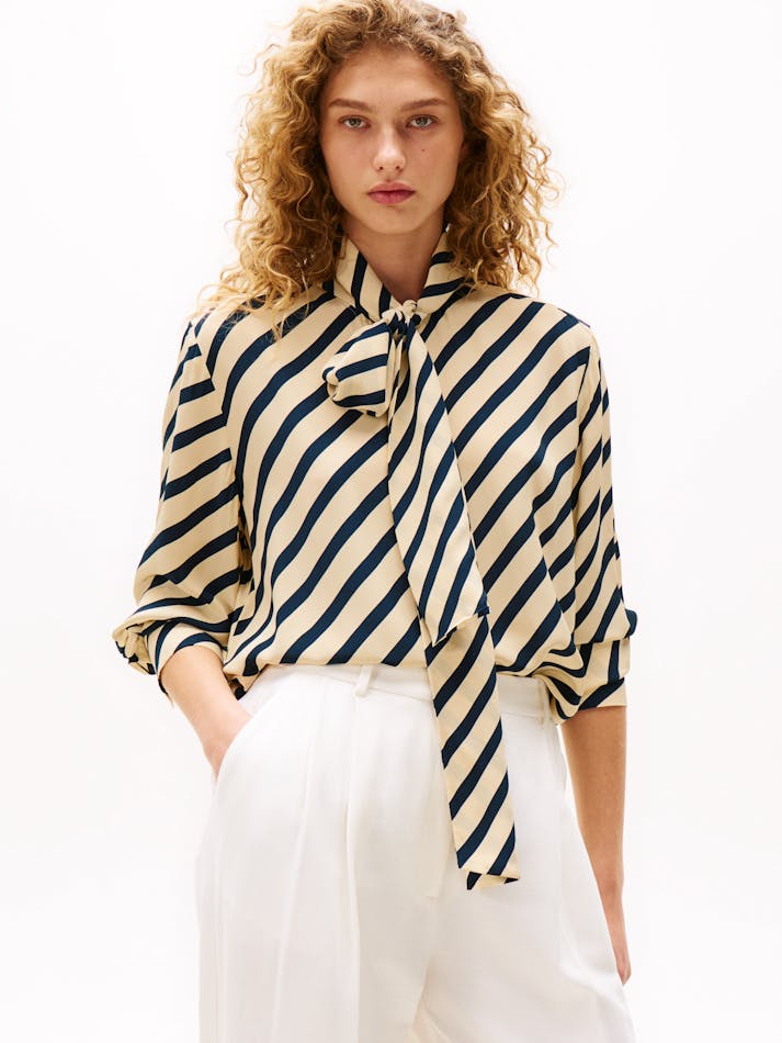 Sofia Richie Grainge lives the everyday twist in Tommy Hilfiger’s most covetable Spring pieces. Express your sense of style on smart days in this relaxed-fit shirt, complete with an eye-catching Breton stripe and tie-neck detailing.