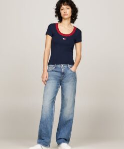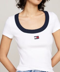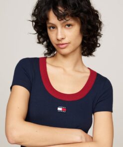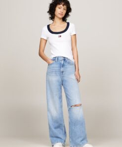 The contrasting scoop neckline and front Tommy badge give this ribbed, stretch-cotton tee a touch of retro-informed style.