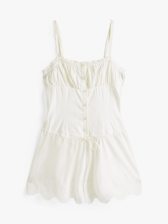 ’90s spirit. Modern style. This enchanting mini fit-and-flare dress features an archival broderie anglaise design and slim spaghetti straps for a light, airy feel.