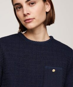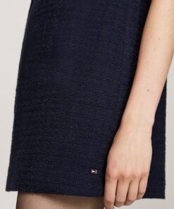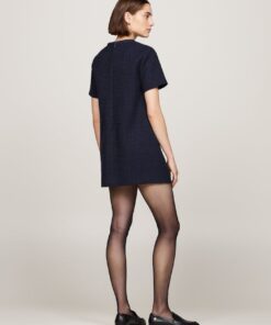 This refined tweed dress exudes sophistication with its elegant contrasting cut and structured A-line shape.