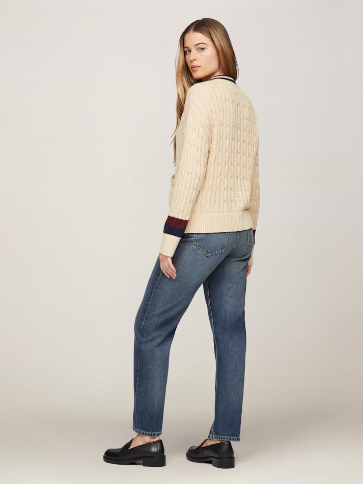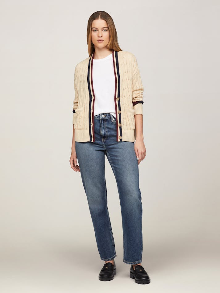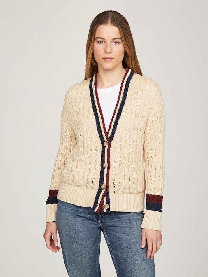 The all-over cable knit and signature stripe trims give this cardigan a varsity inspired feel. Crafted from pure cotton, this knit is finished with patch pockets and discreet Tommy branding.