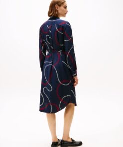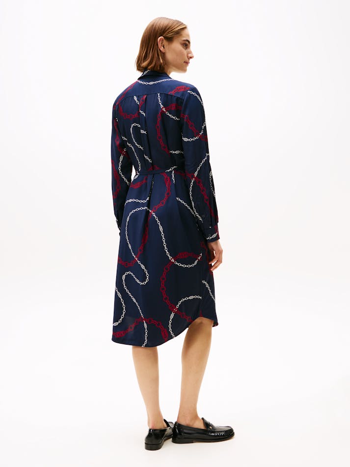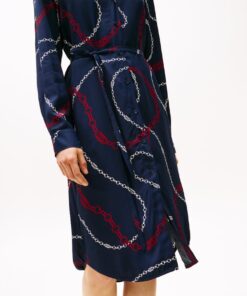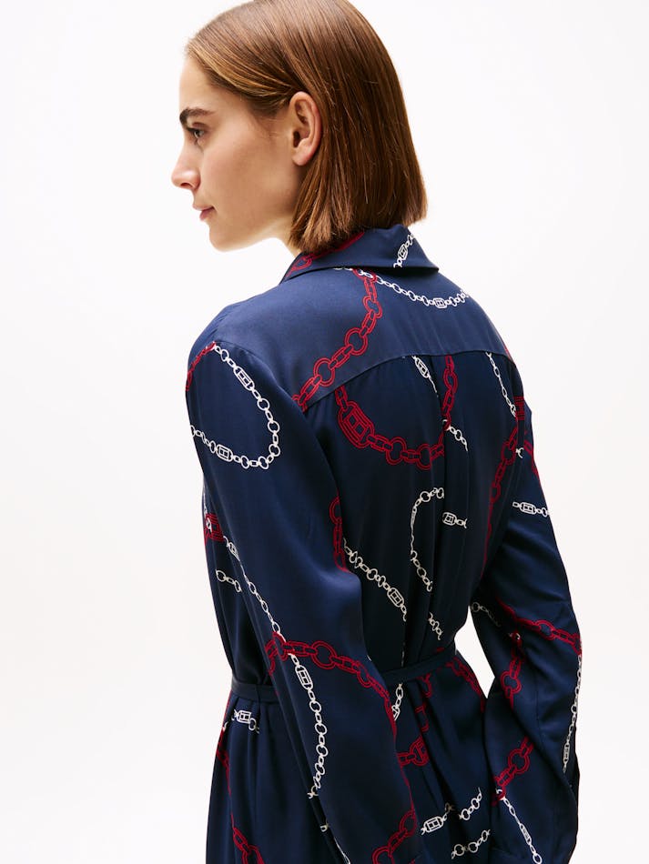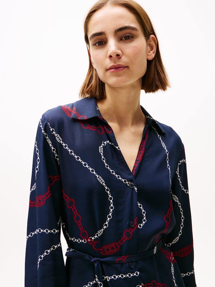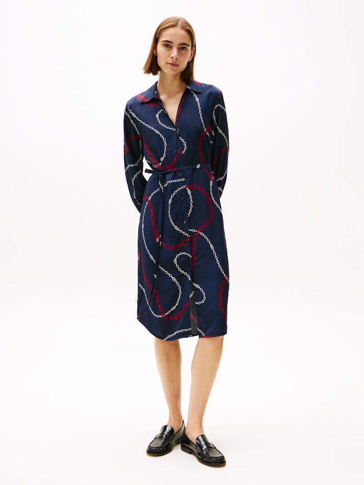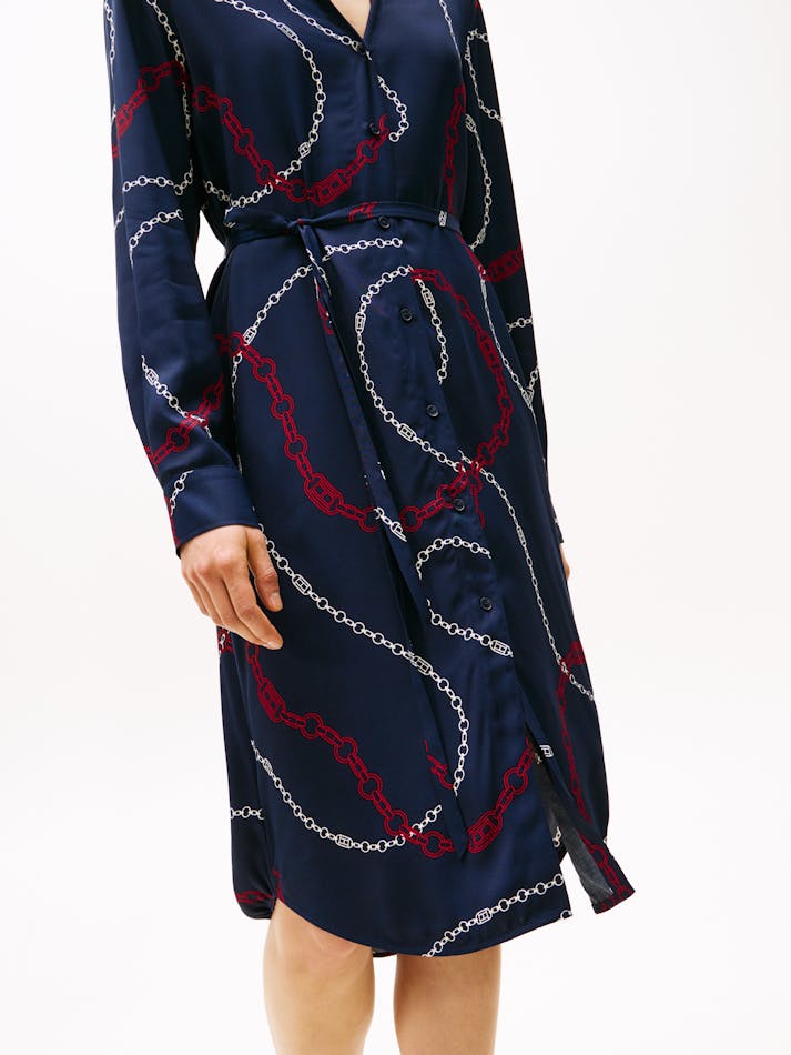 Made from soft viscose, this shirt dress features a button front and self tie waist, complemented by a bold all-over chain print for a sophisticated finish.